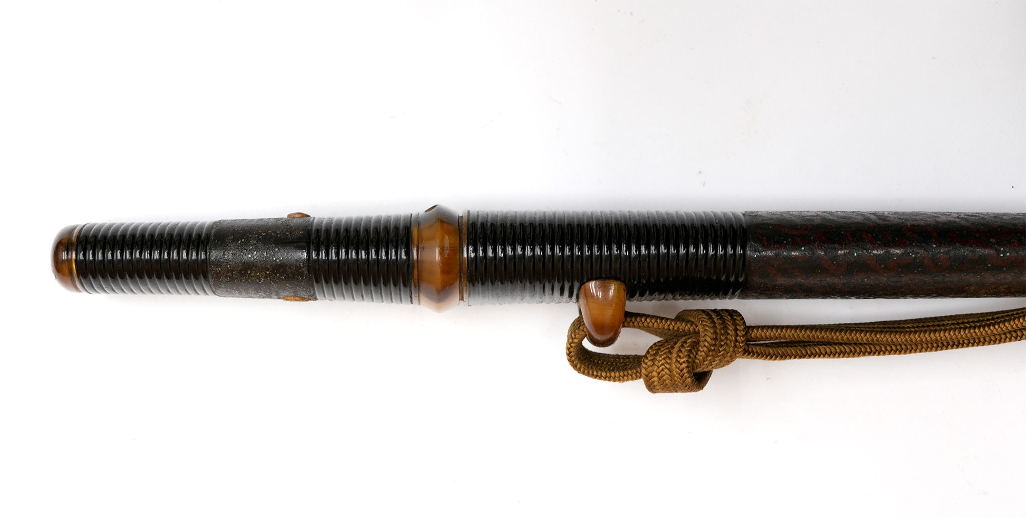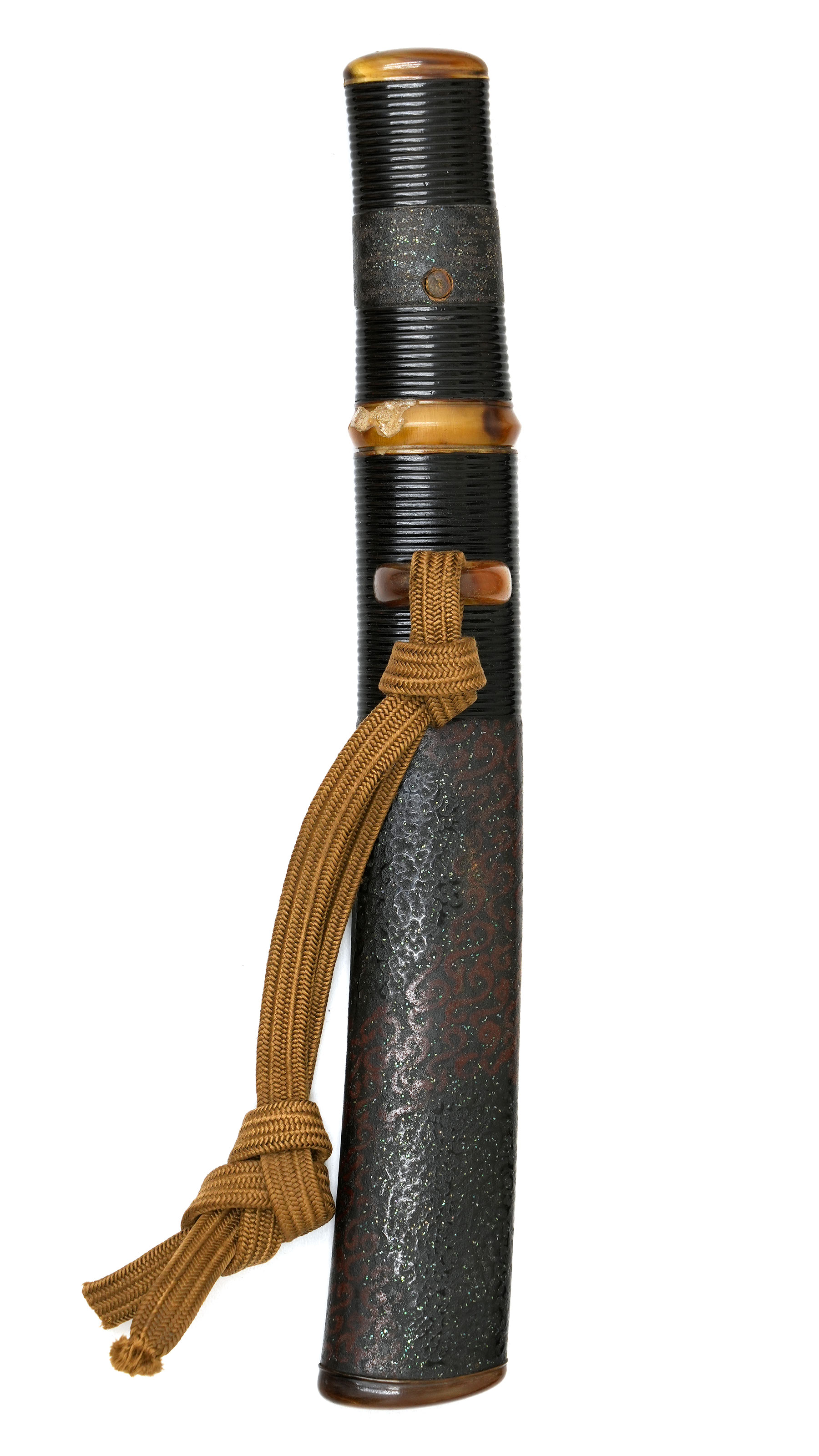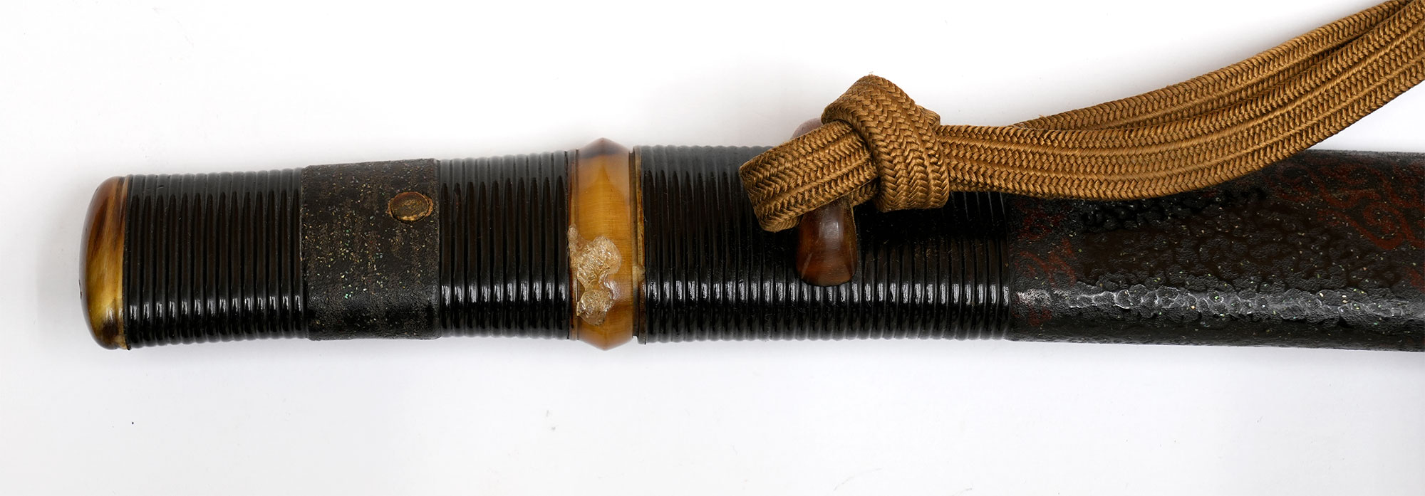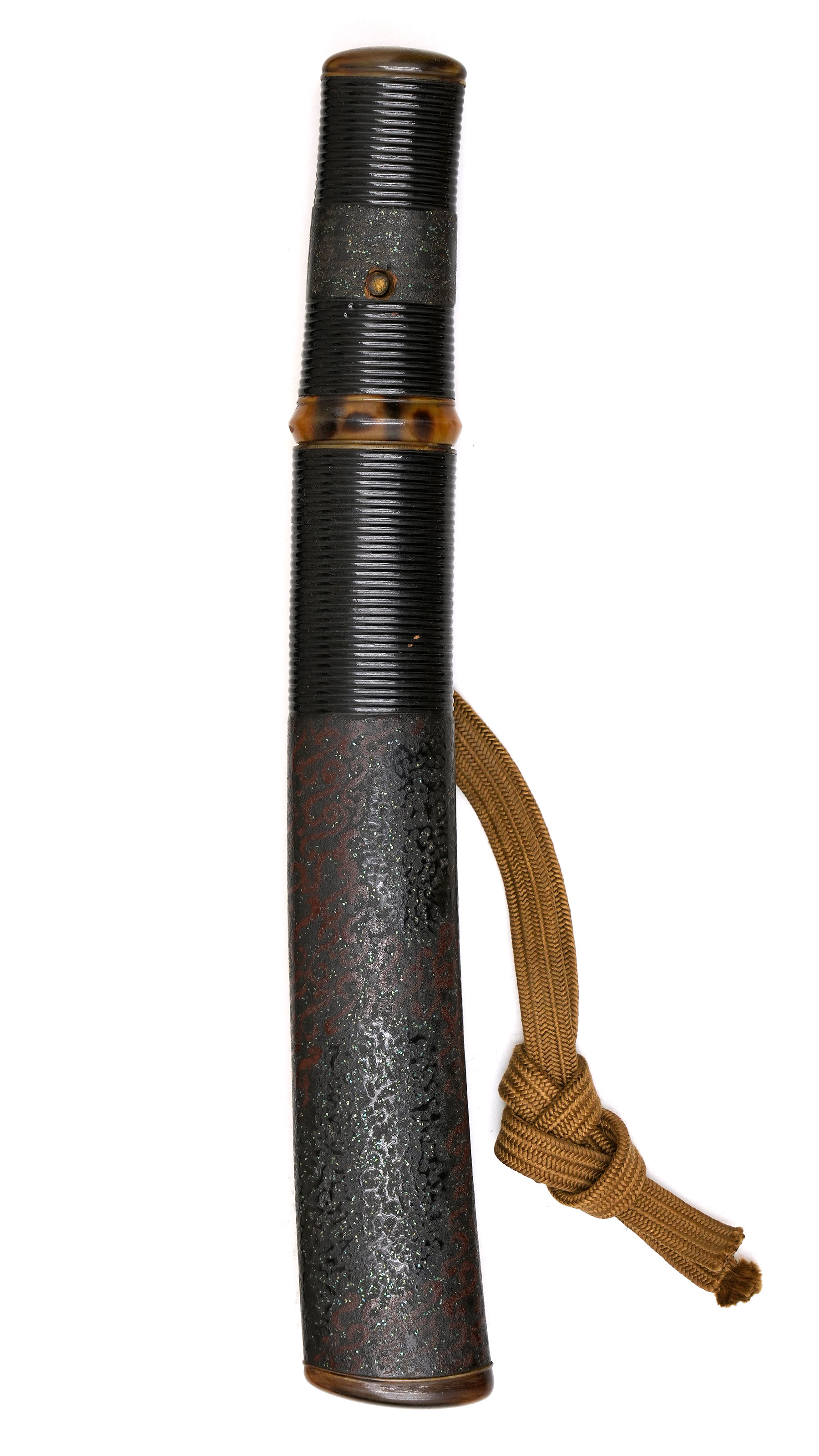 附属する拵は、柄と鞘の腰部分に意匠を凝らした千段刻みを施し、さらに変わり塗りで仕上げられた大変味わい深い作です。縁頭をはじめ、栗形や鐺に至るまで希少な鼈甲を用いて造られており、柄のがたつきも一切なく、拵全体から格調の高さとこだわりが窺えます。
