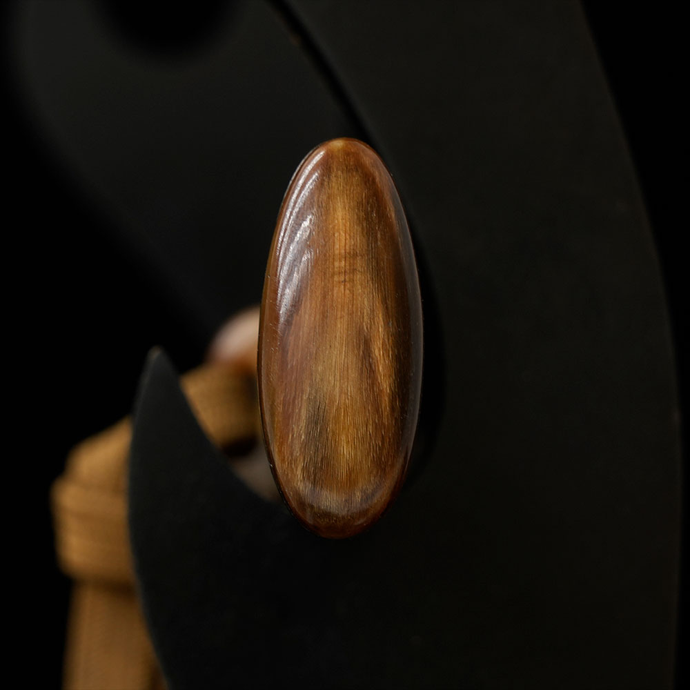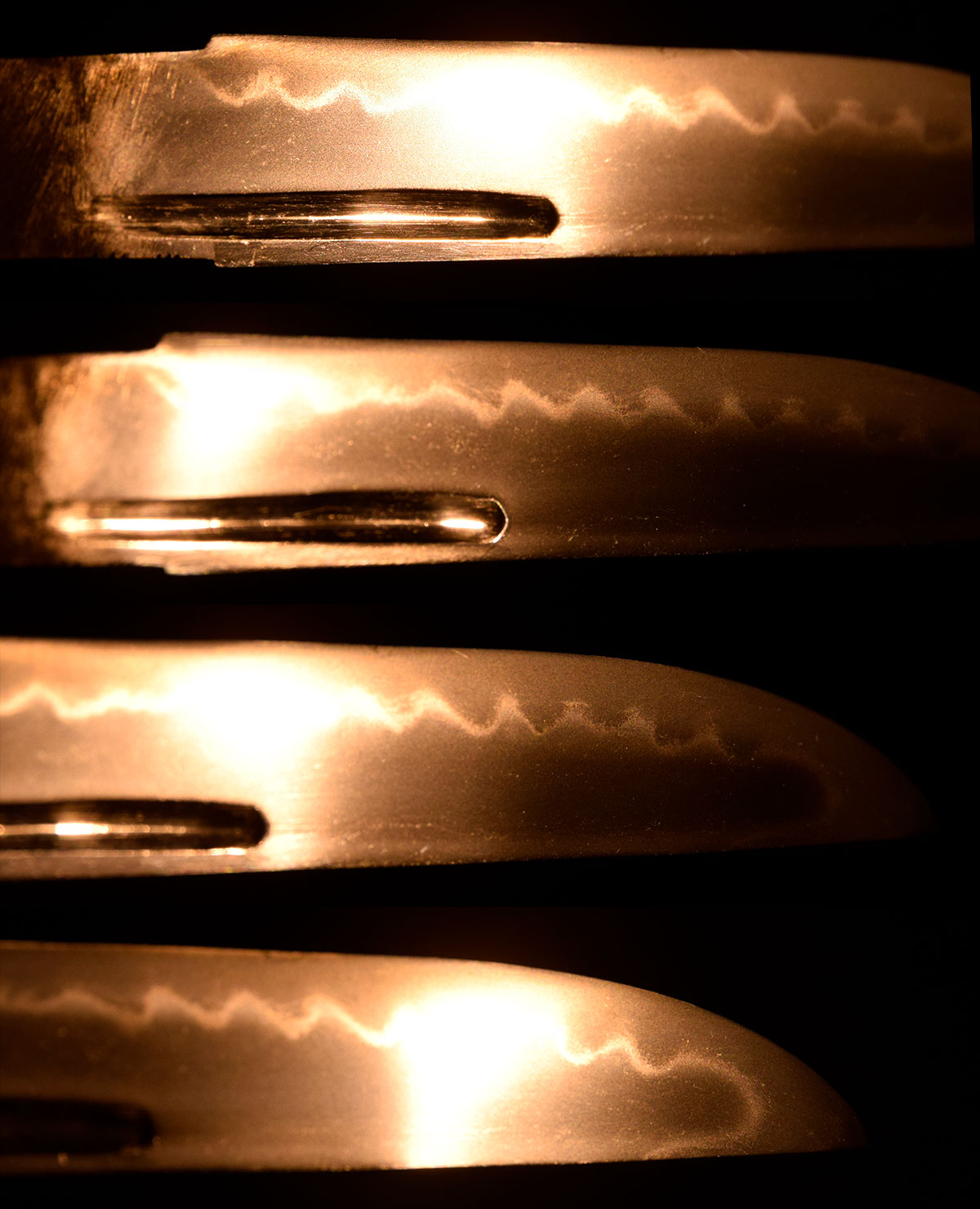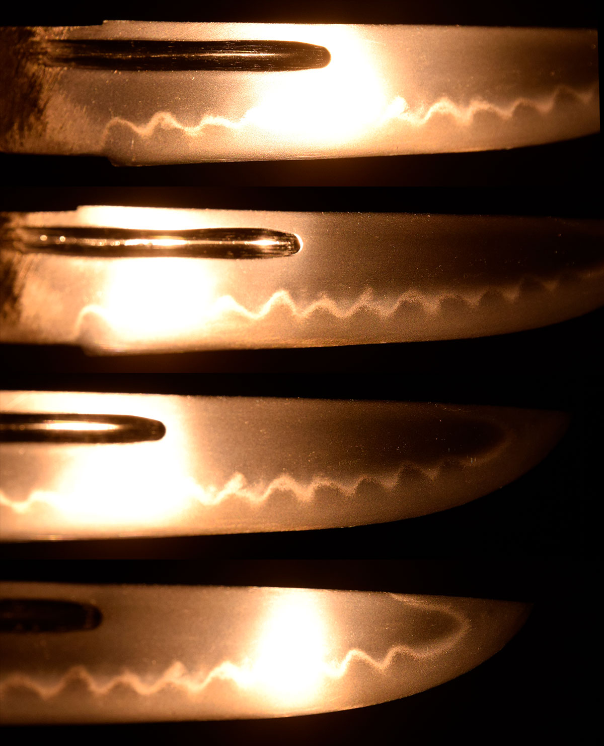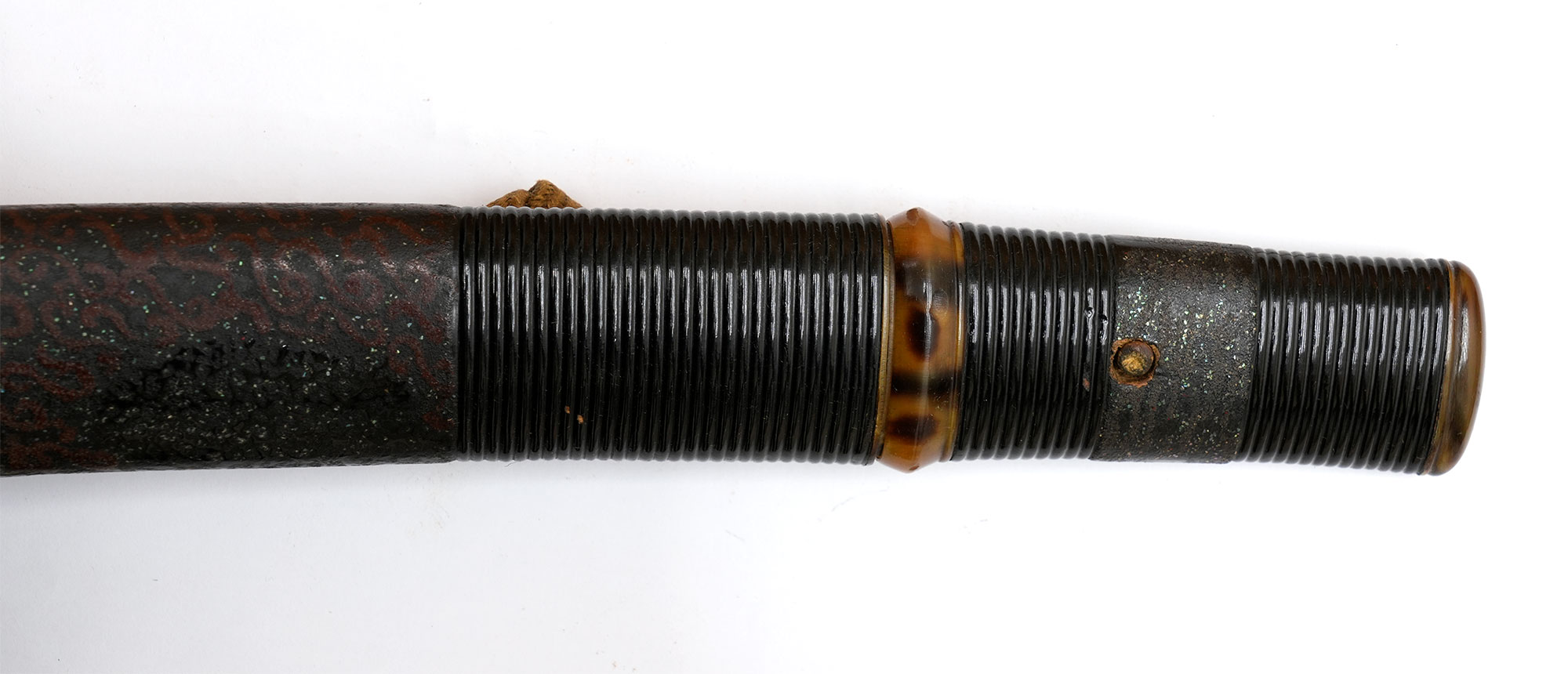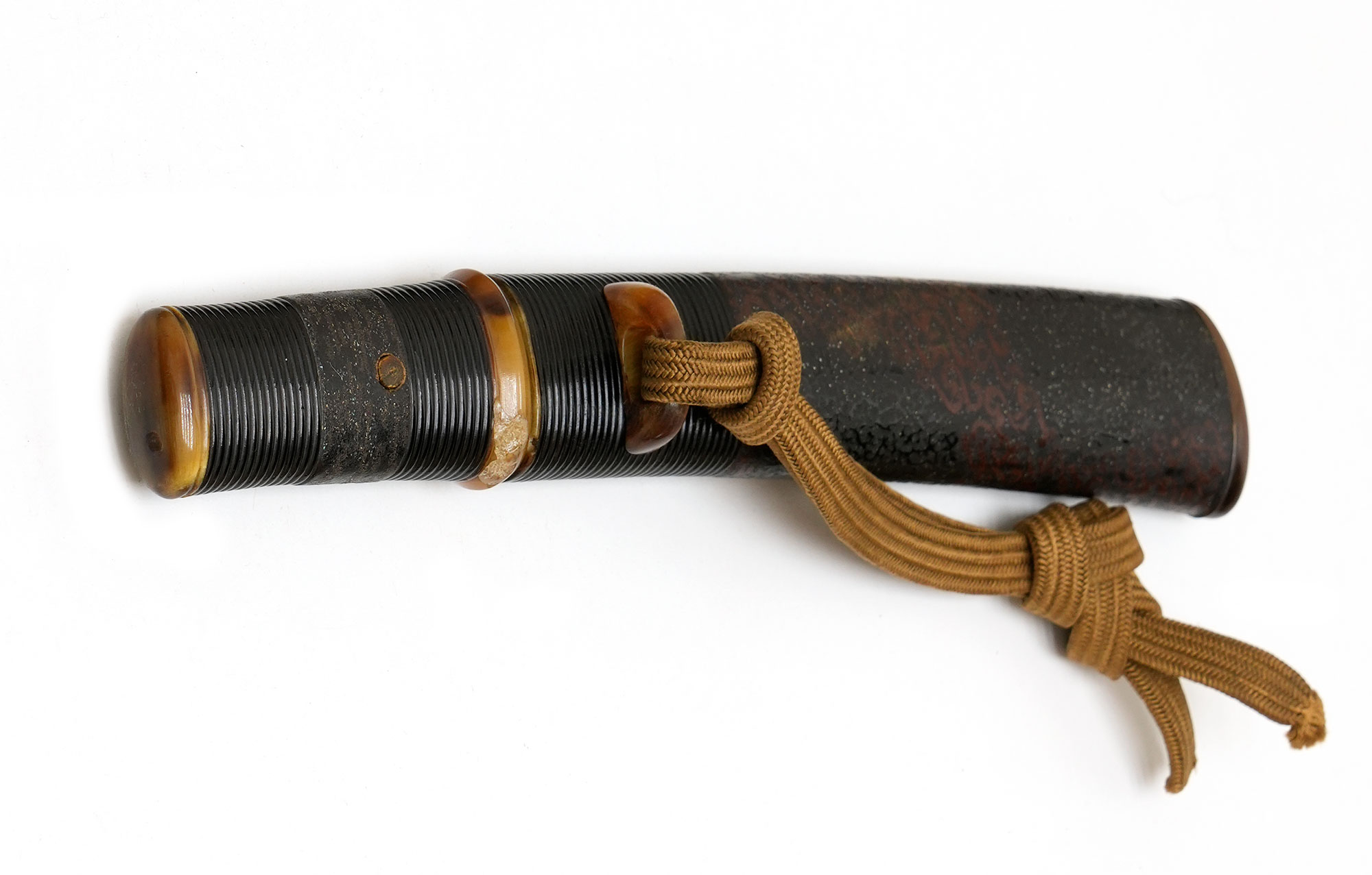 附属する拵は、柄と鞘の腰部分に意匠を凝らした千段刻みを施し、さらに変わり塗りで仕上げられた大変味わい深い作です。縁頭をはじめ、栗形や鐺に至るまで希少な鼈甲を用いて造られており、柄のがたつきも一切なく、拵全体から格調の高さとこだわりが窺えます。