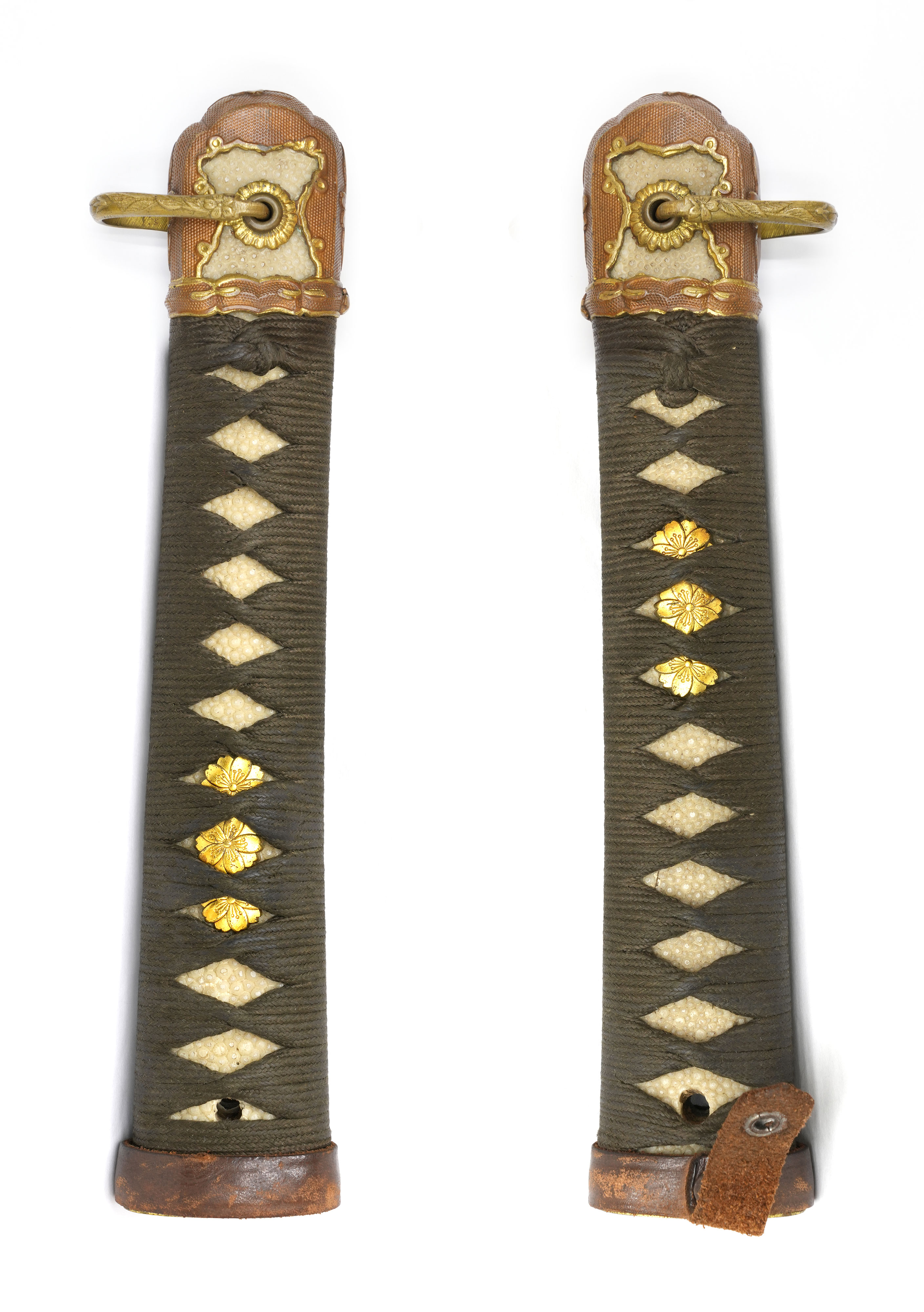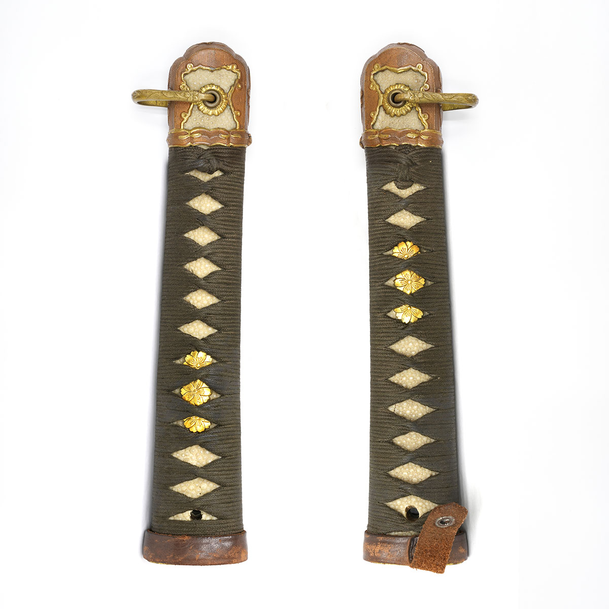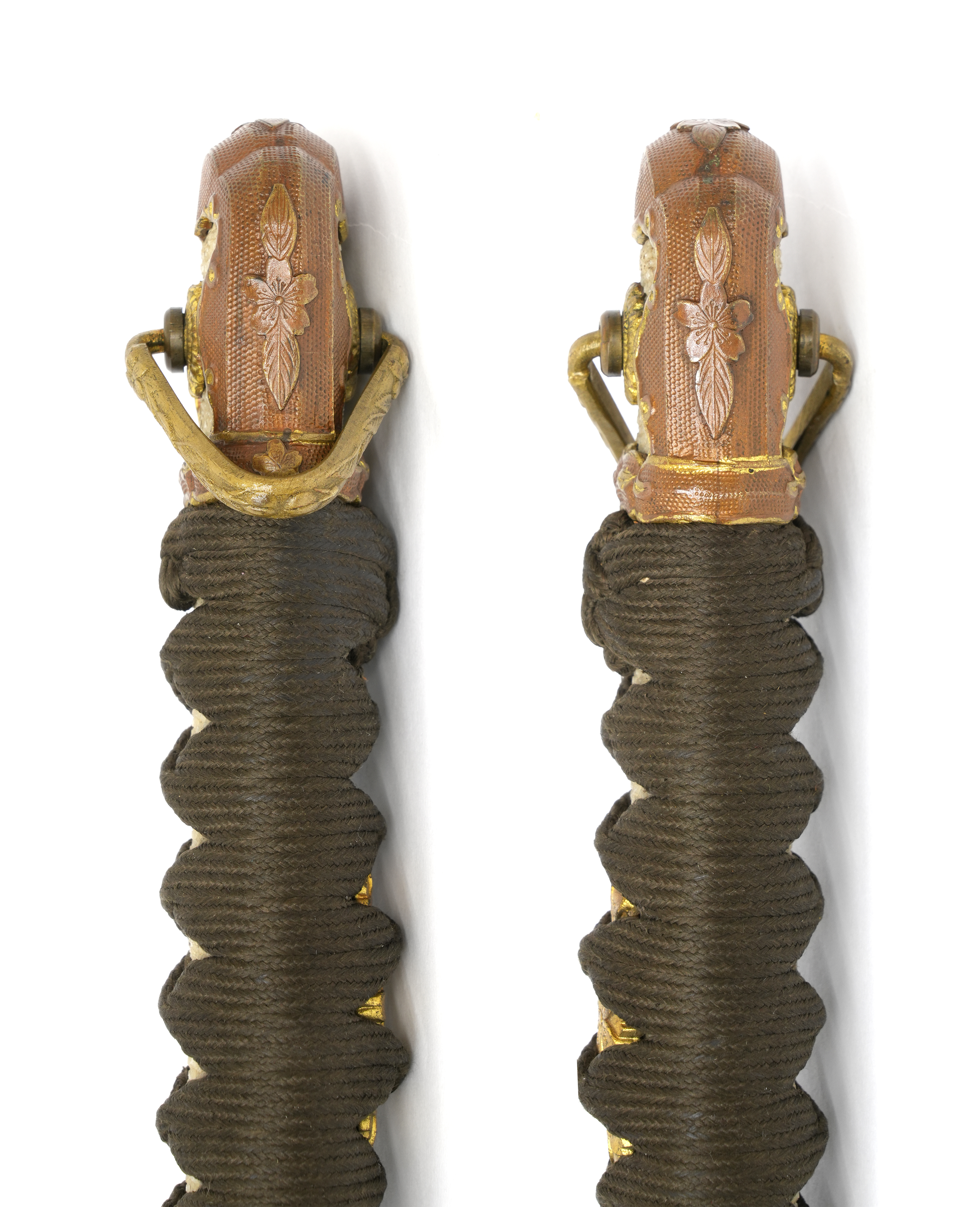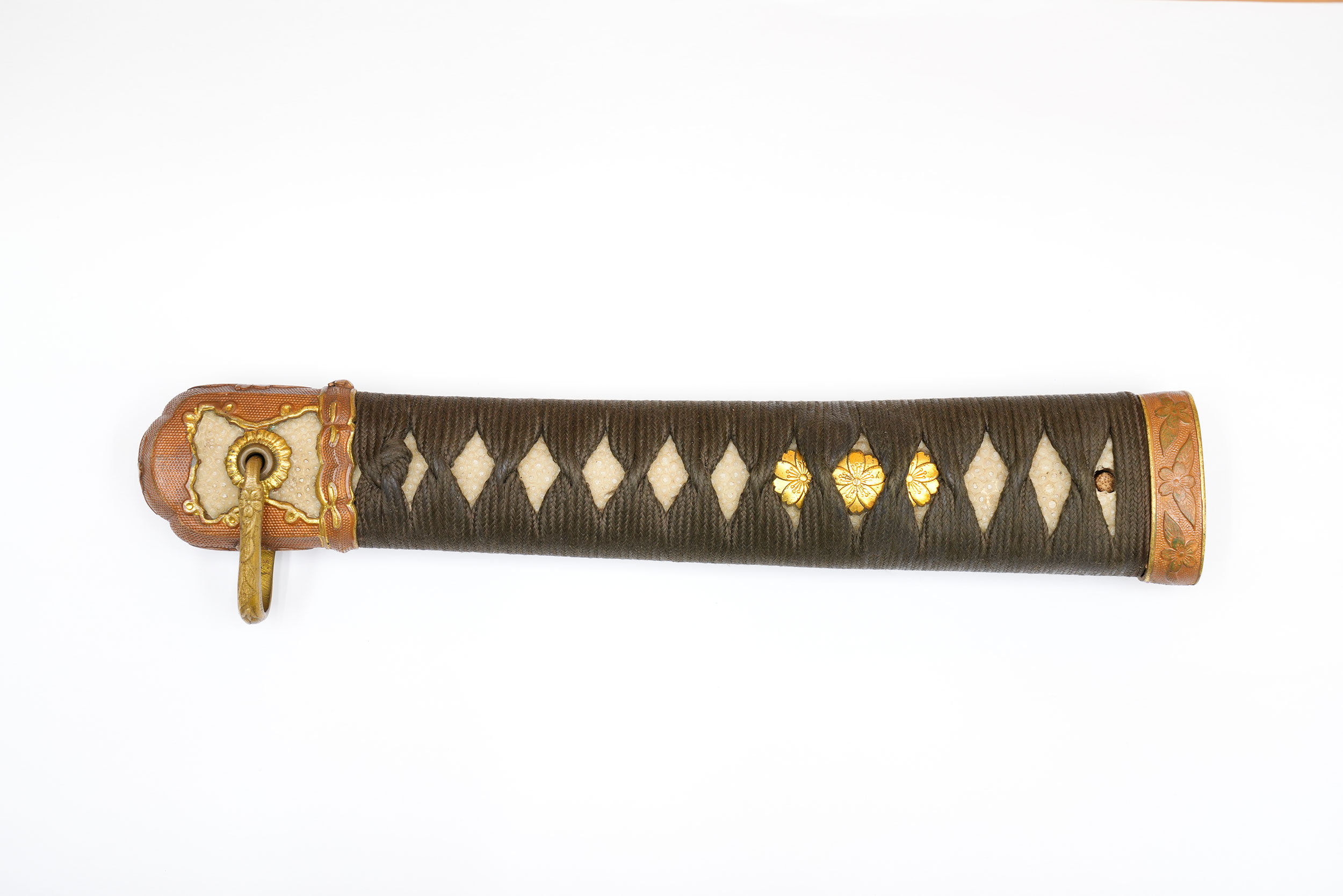 縁頭や猿手鐶の桜花葉もしっかりとしており、柄糸の状態も良く、目貫は今なお黄金色に輝いており、お手持ちの軍刀のリストアにも、部品取りにも最適です。