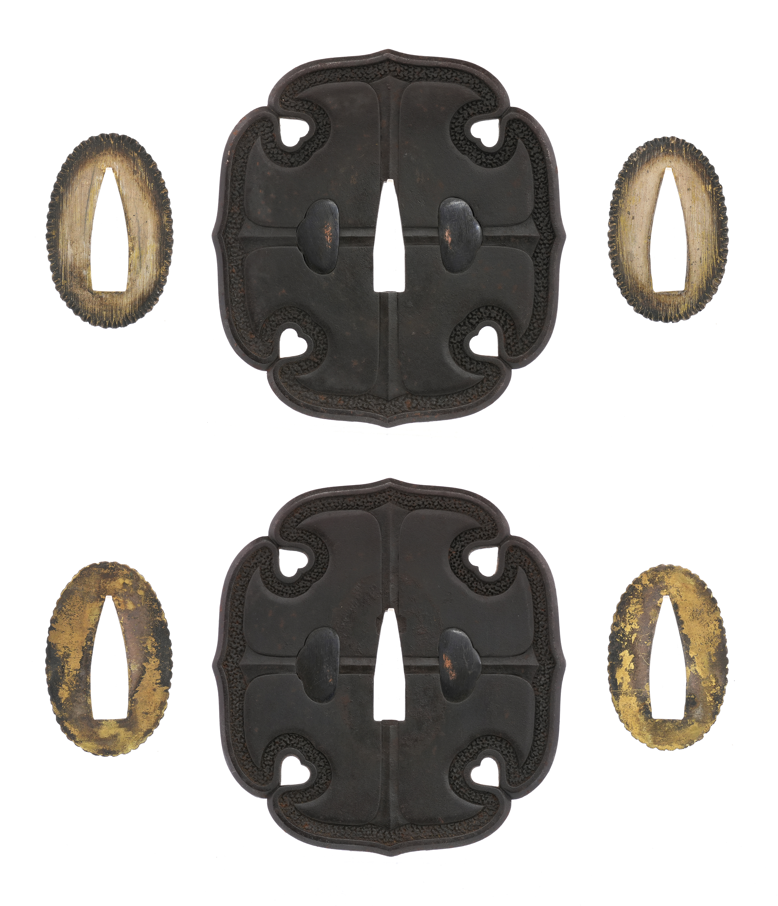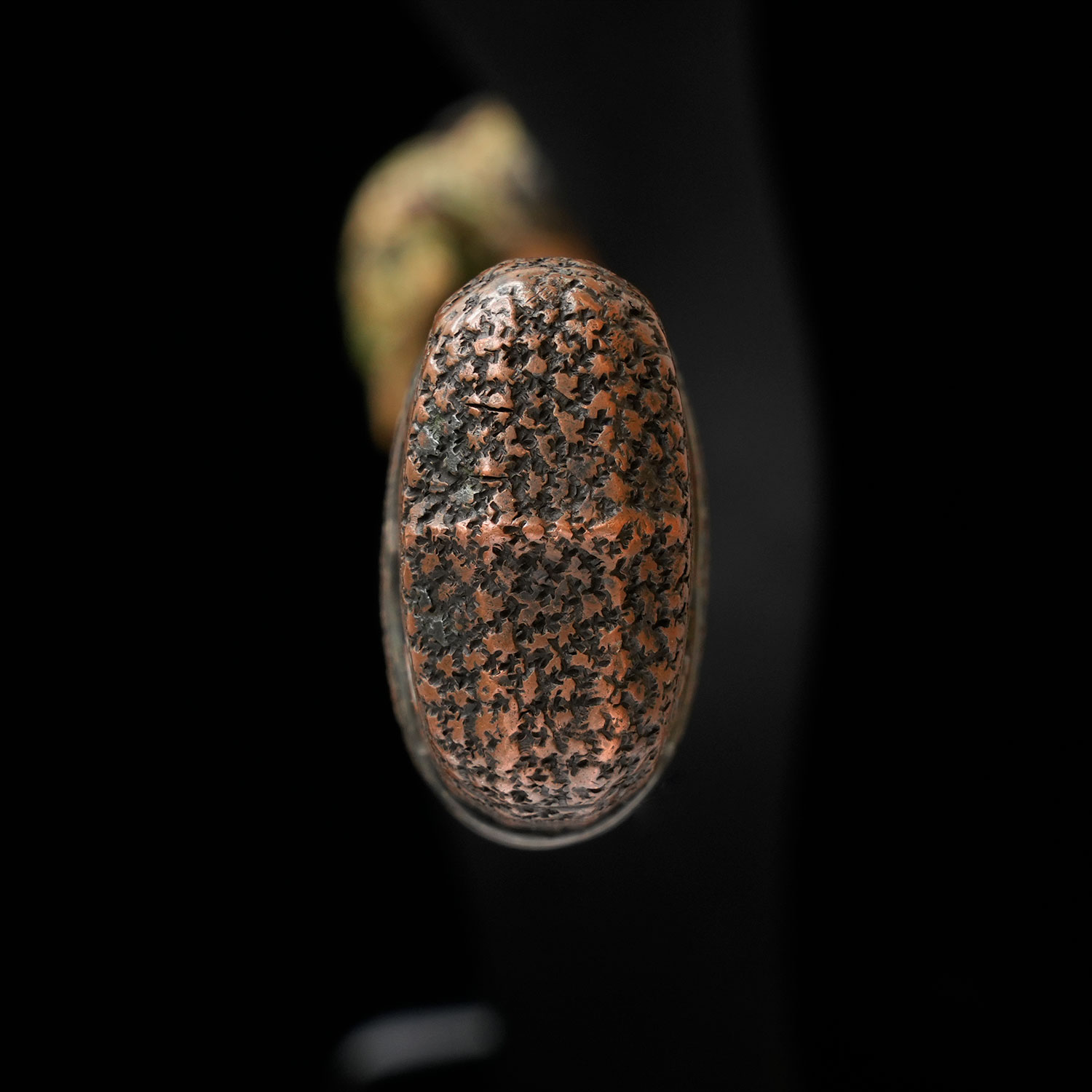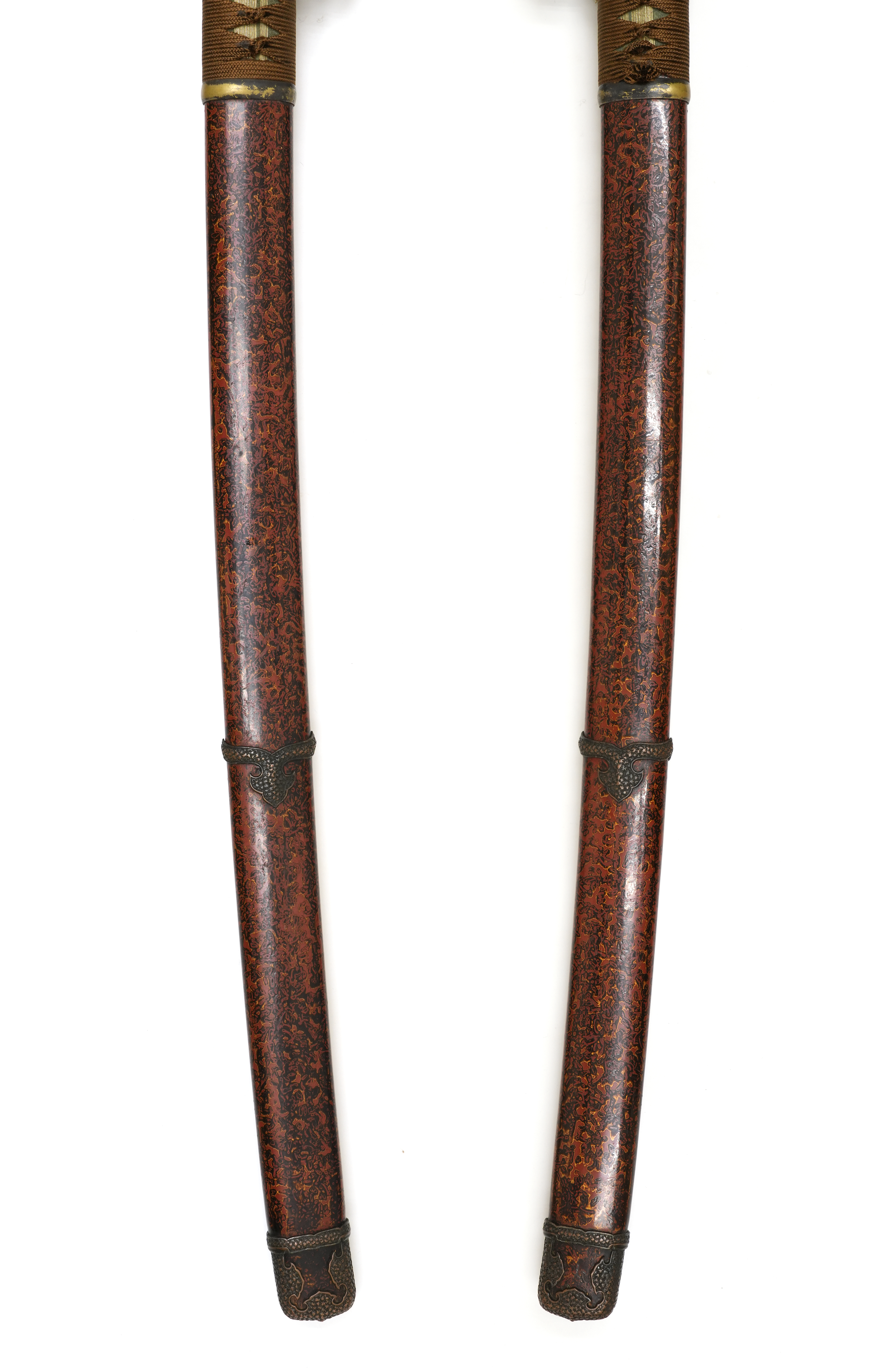 岩肌を思わせる武骨な槌目地の金具を用い、全体の装飾を抑えた渋い佇まいの中に、赤茶系の変わり塗りを施した鞘が一際目を惹く印象的な陣太刀拵です。