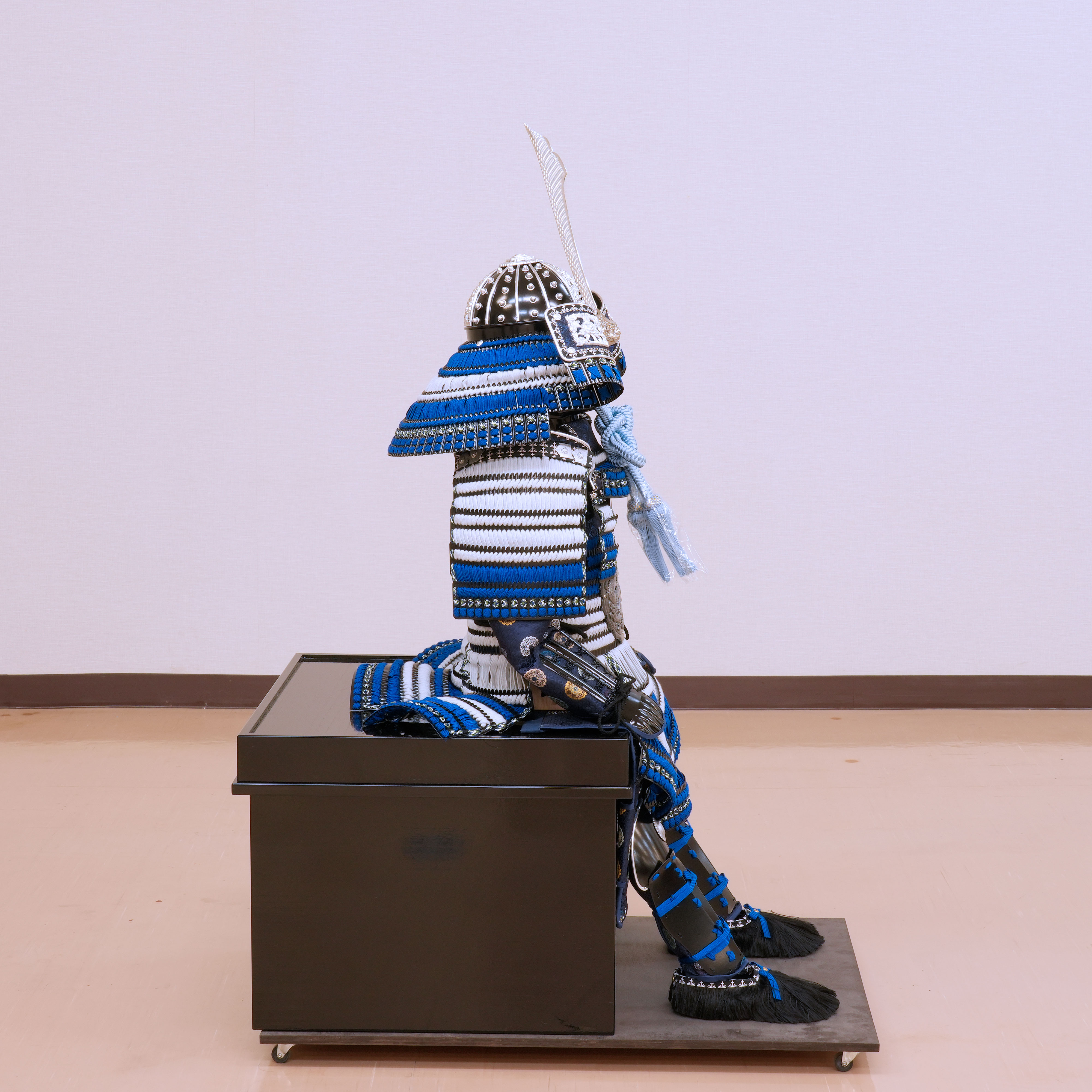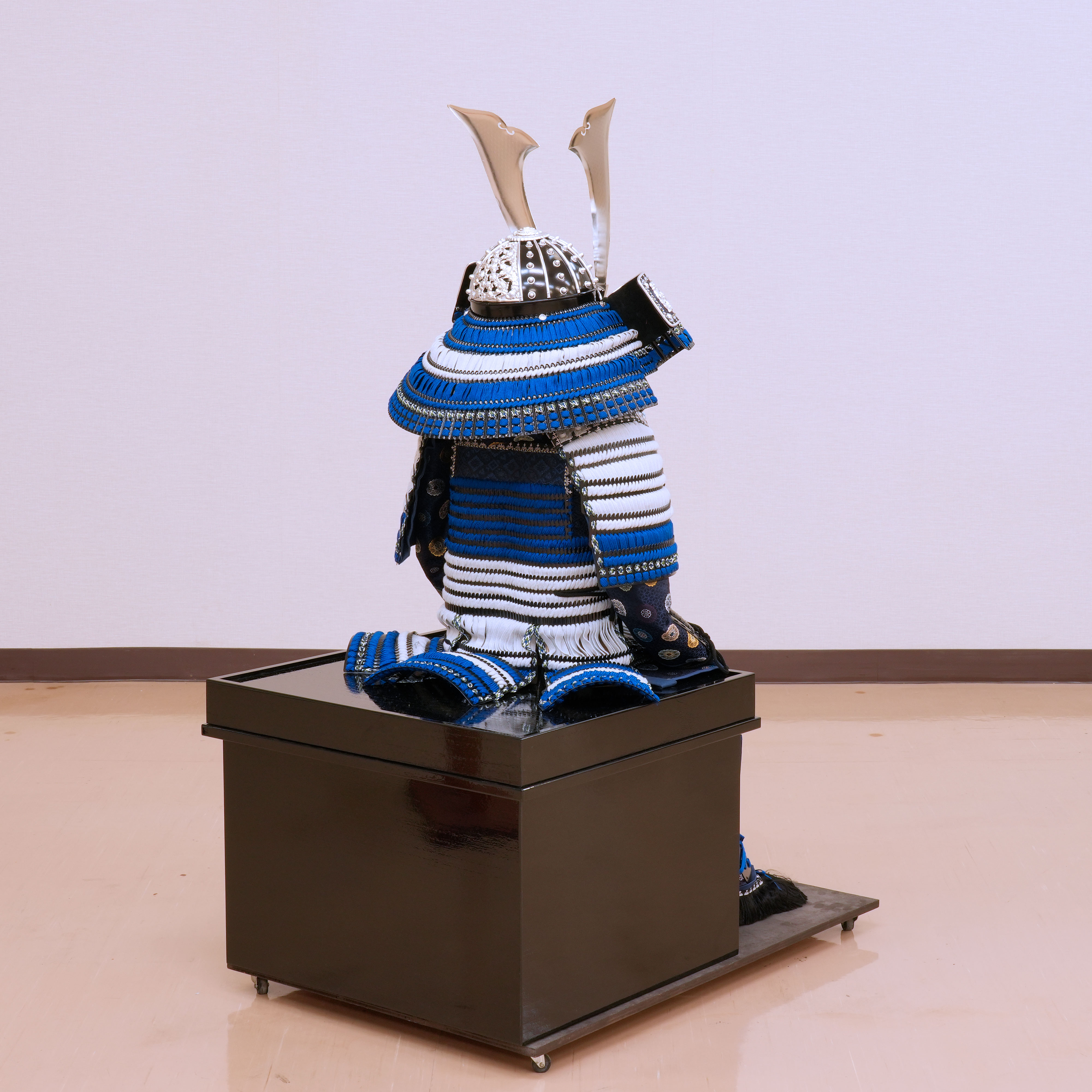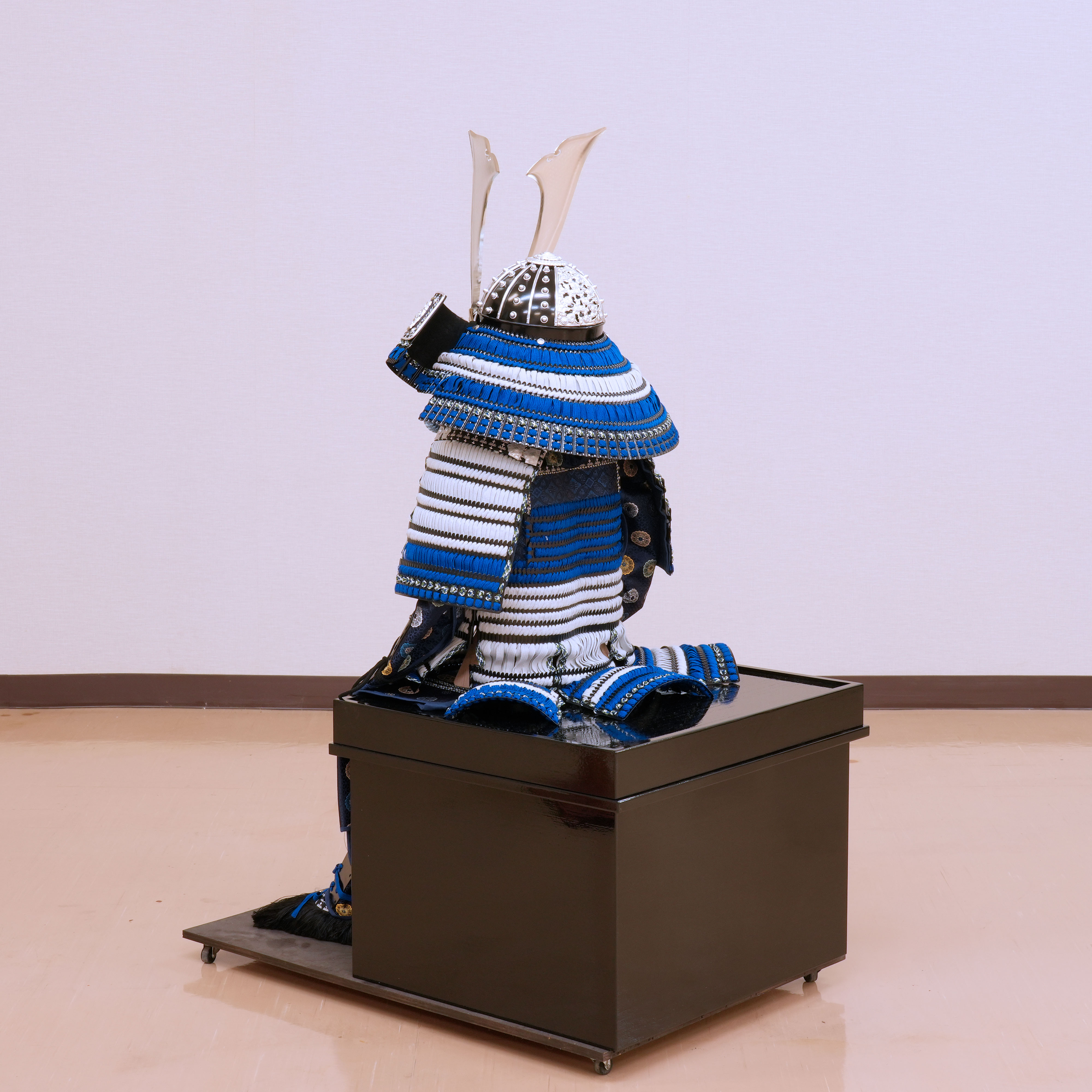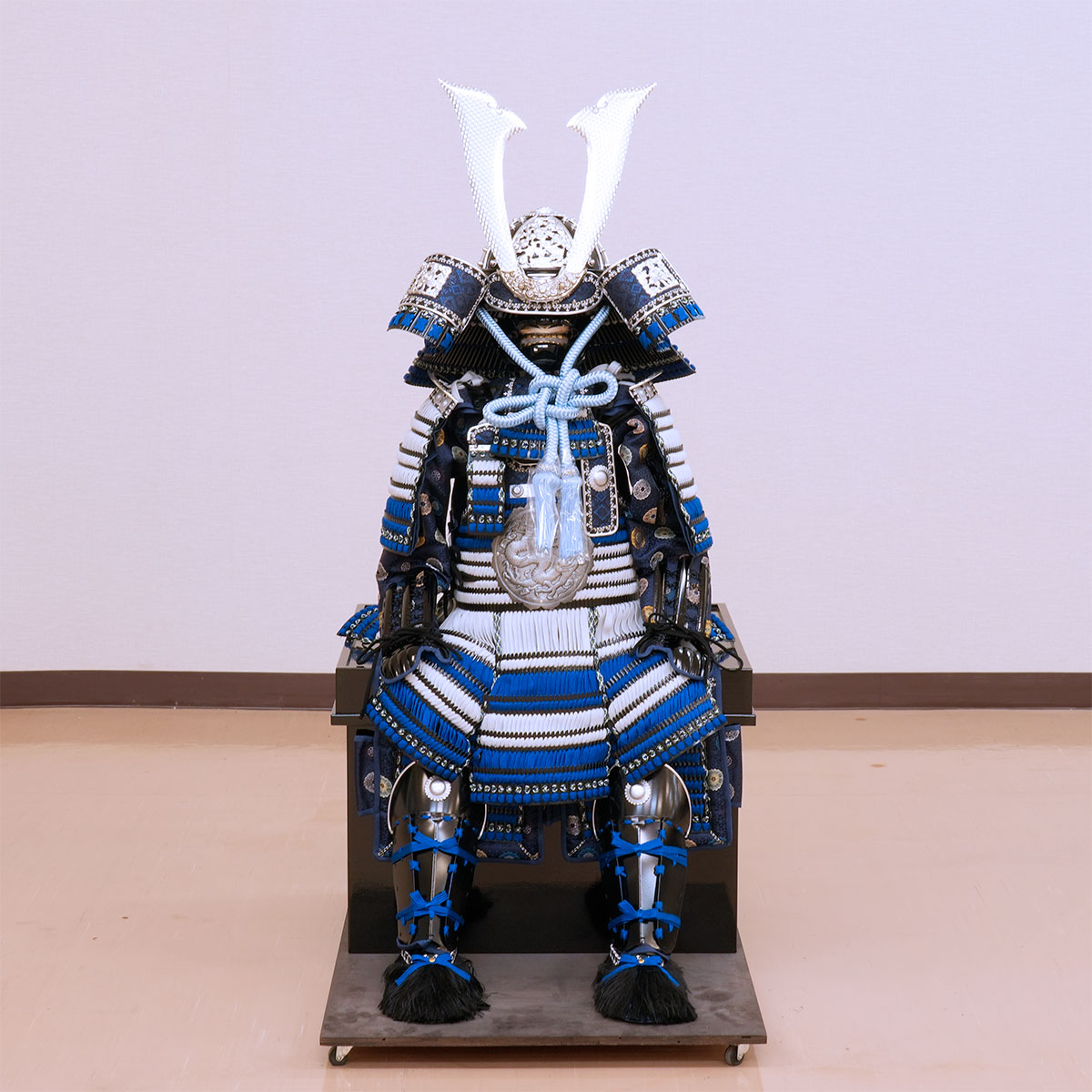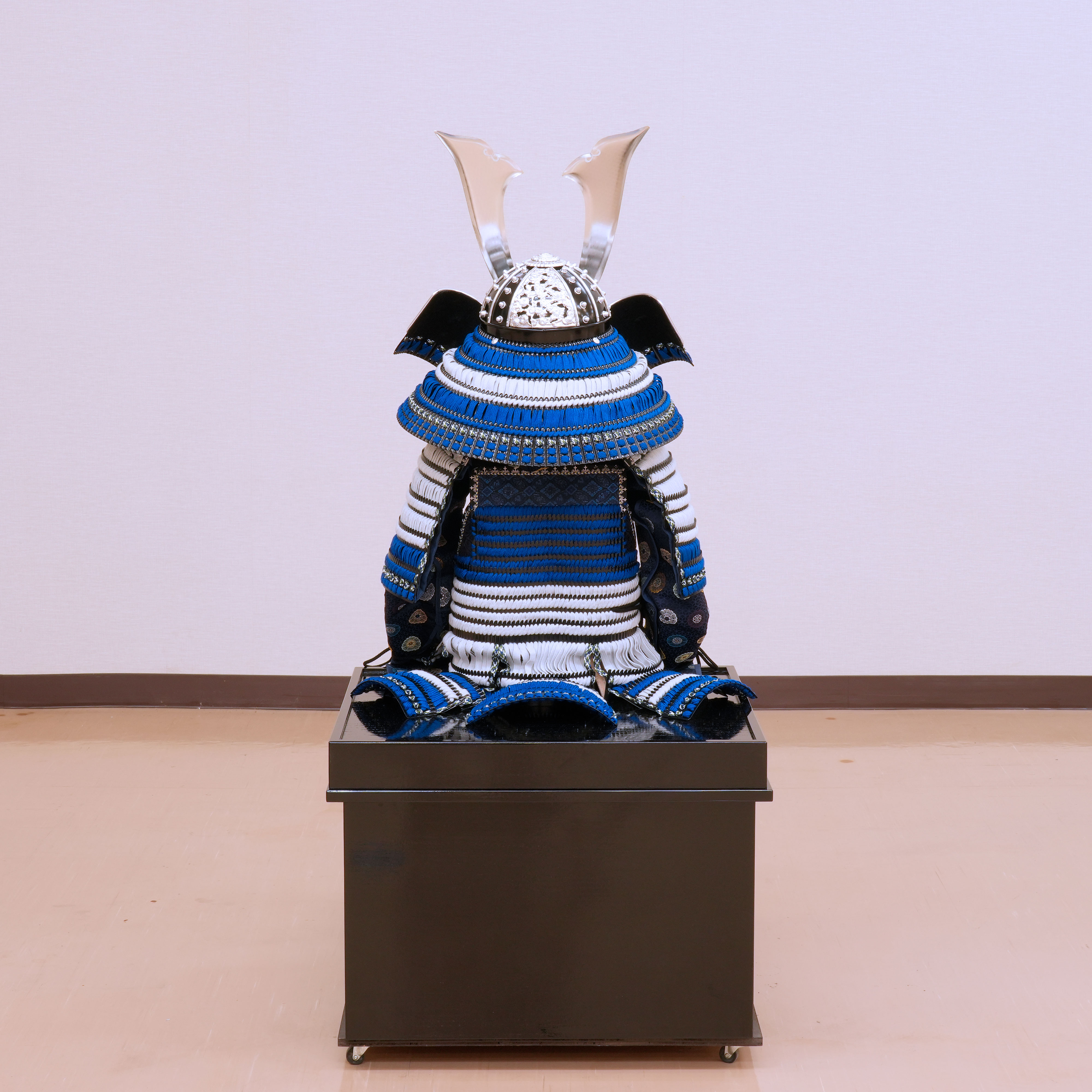 清らかな青と純白の糸で鮮やかに威された、現代の職人による真新しい稚児具足です。時代を経た古い品ではなく、一度も袖を通されていない清々しい一領となります。
