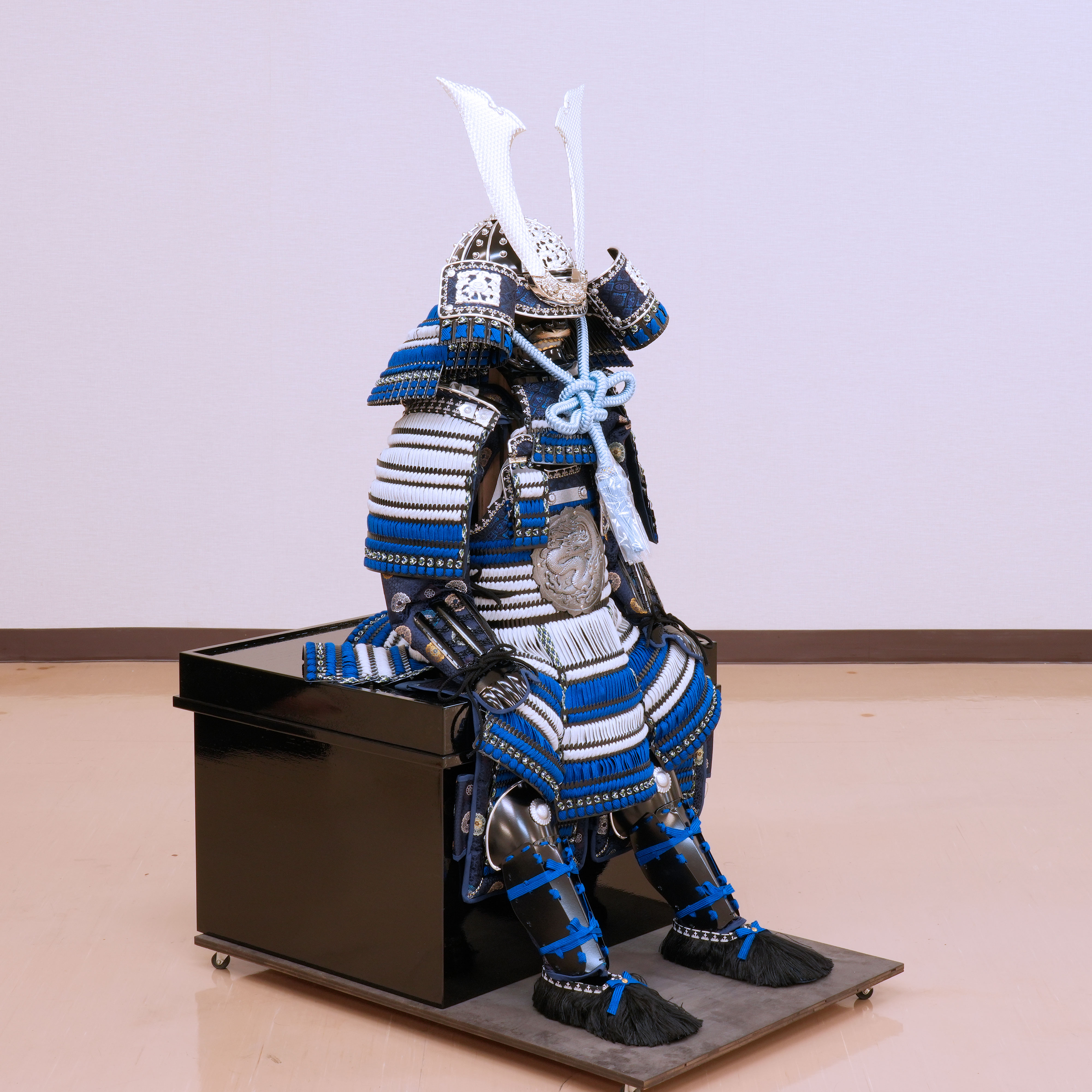 全体を青と白の二色で統一した、凛と張り詰めたような気高い佇まいが魅力です。胴や袖には、板札に細やかな段差を刻んで本小札のように見せる「切付小札」の技法が用いられており、手間の掛かった造り込みとなっております。胴の中央には、力強い龍の意匠が配されており、お子様の健やかな成長と輝かしい立身出世を願う深い祈りが込められています。