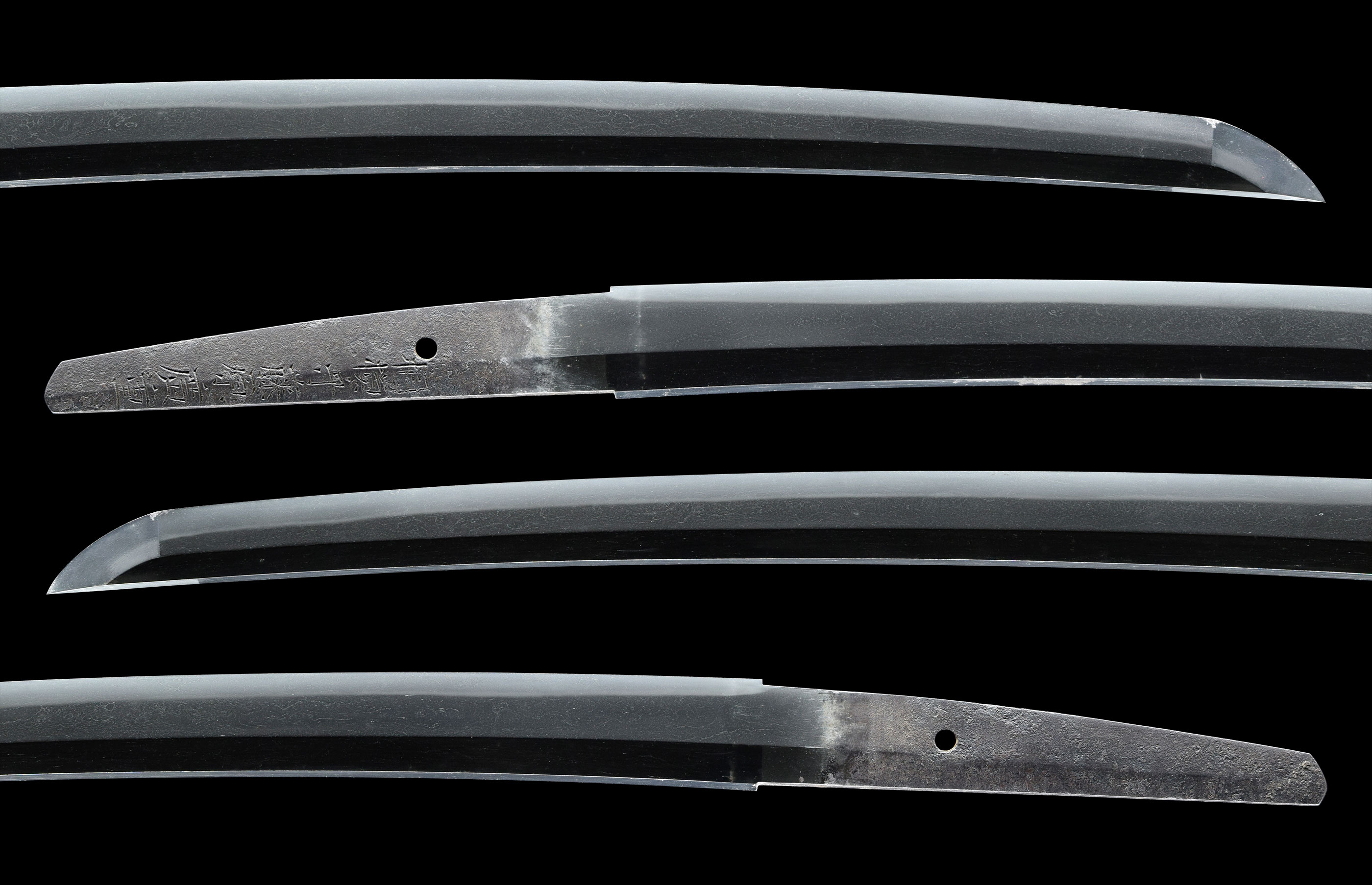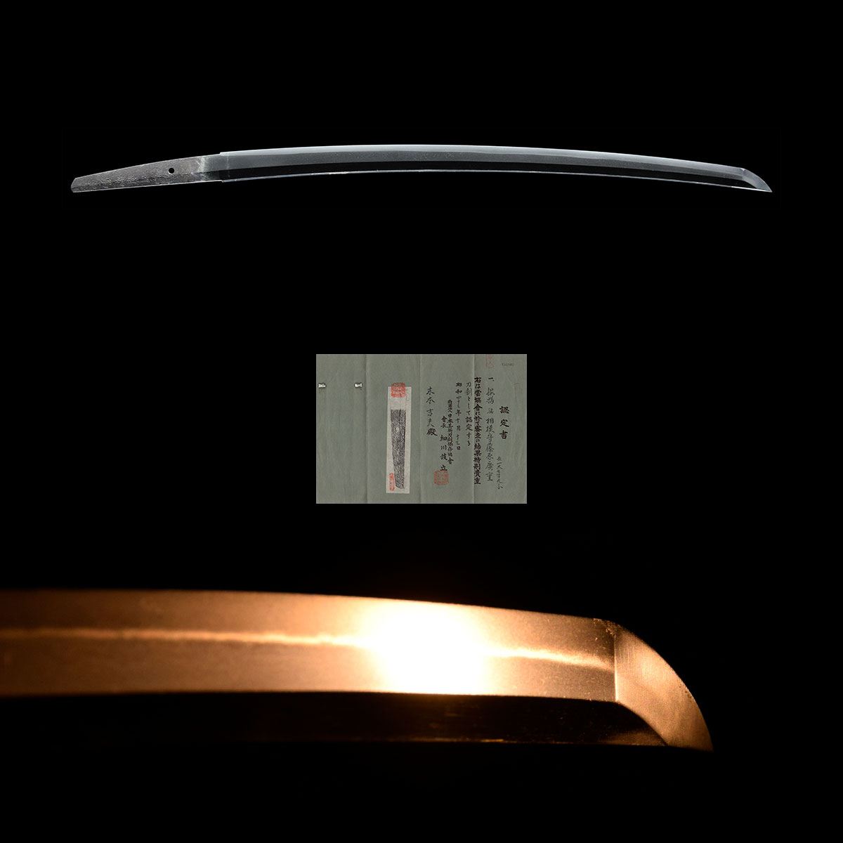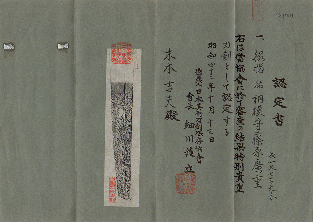刀身の出来が非常に良く、附属する文様入りのはばきからも、相当な上士の指料であったことが窺えます。上述の小錆を部分研磨されるか、或いは全体を再研磨頂き、特別保存刀剣同時審査を御受審頂いて末長く御愛蔵頂きたい逸品です。