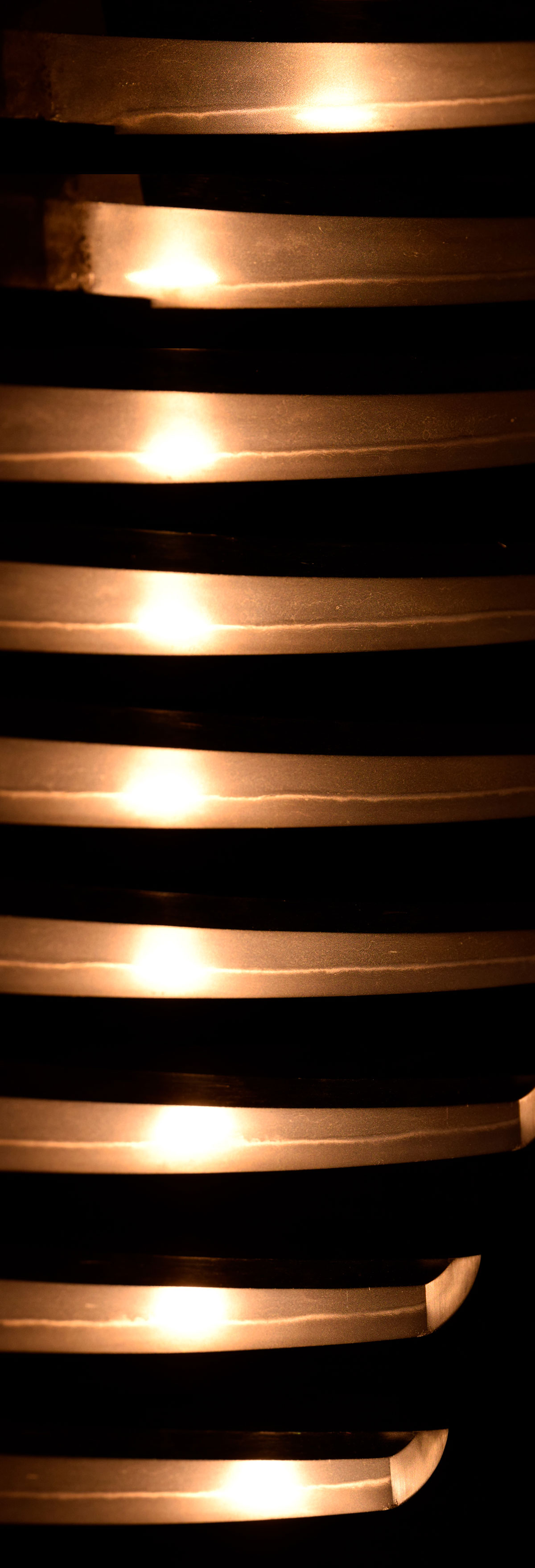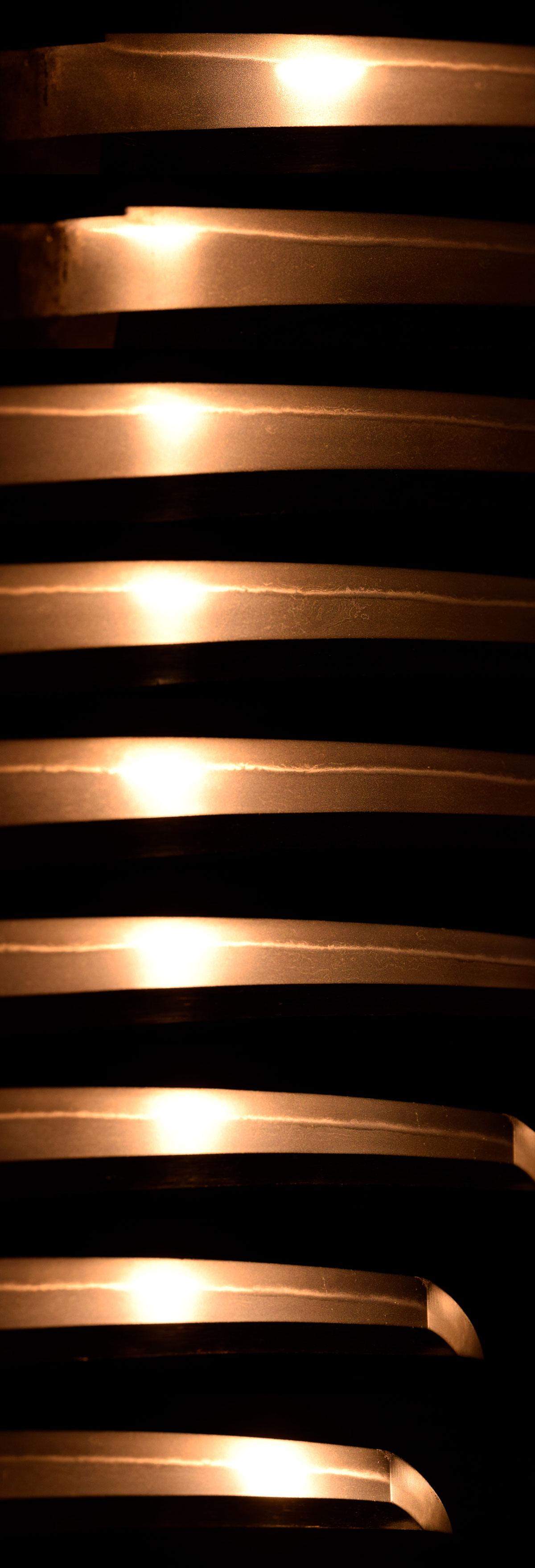 この脇指は元先の差が程好く開いて中切先となった、如何にも日本刀といった印象を与える上品な体配が印象的で、地鉄は小板目杢交じりで良く練れ、少しく肌立ち、纏まりが良く、刃文は匂口明るく冴えた直刃で、刃縁には地鉄に絡んだ金筋や稲妻が顕著。匂口は刃方と棟方双方に向かって微細に乱れ、鼠足入り、帽子は表裏共に直ぐに丸く返っています。