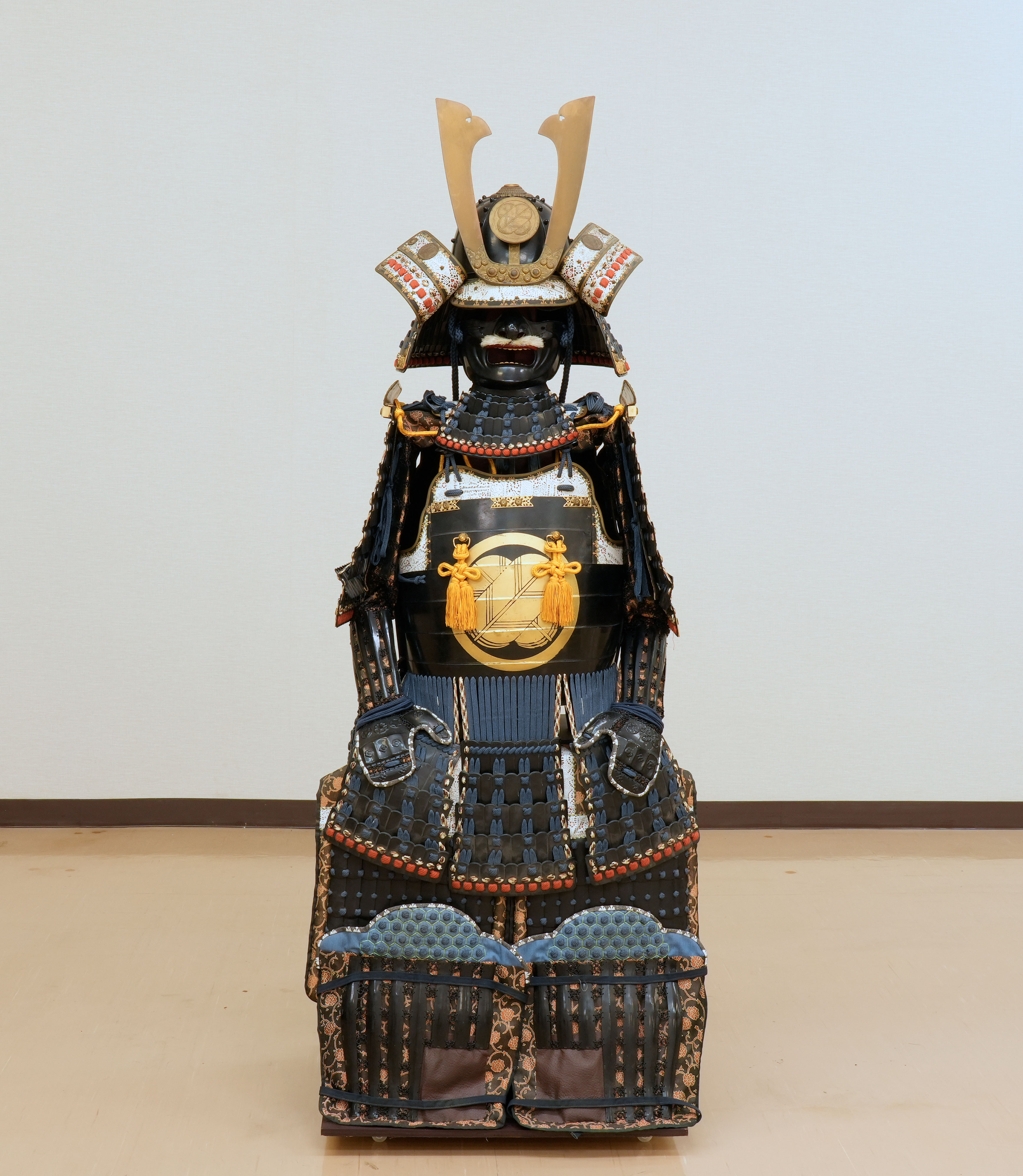 大ぶりな鍬形を備えた兜から、丸に違い鷹の羽紋が配された前胴、そして佩楯に至るまで隙なく揃えられており、床の間を圧倒的な武威で満たしてくれる威風堂々たる優品です。