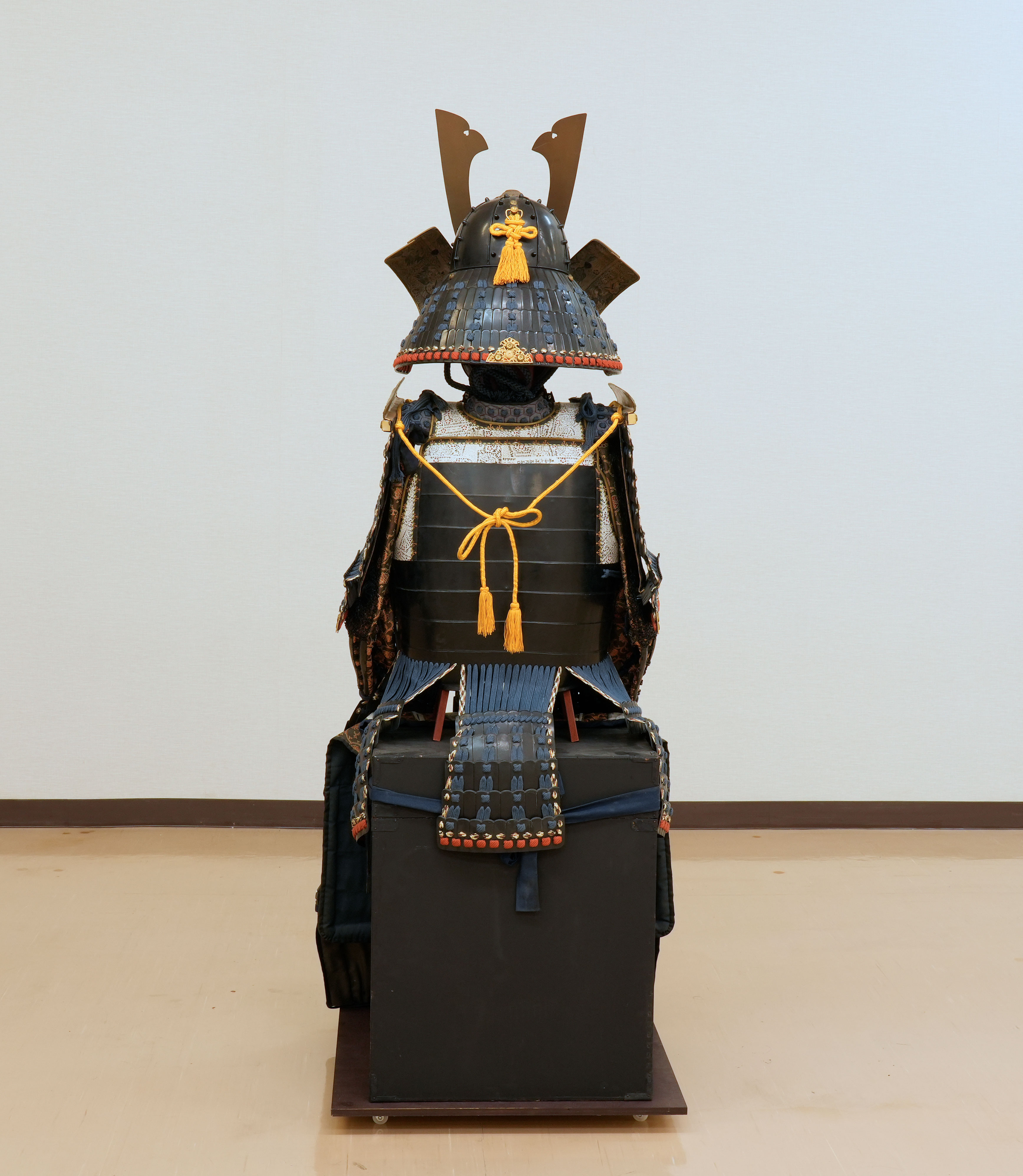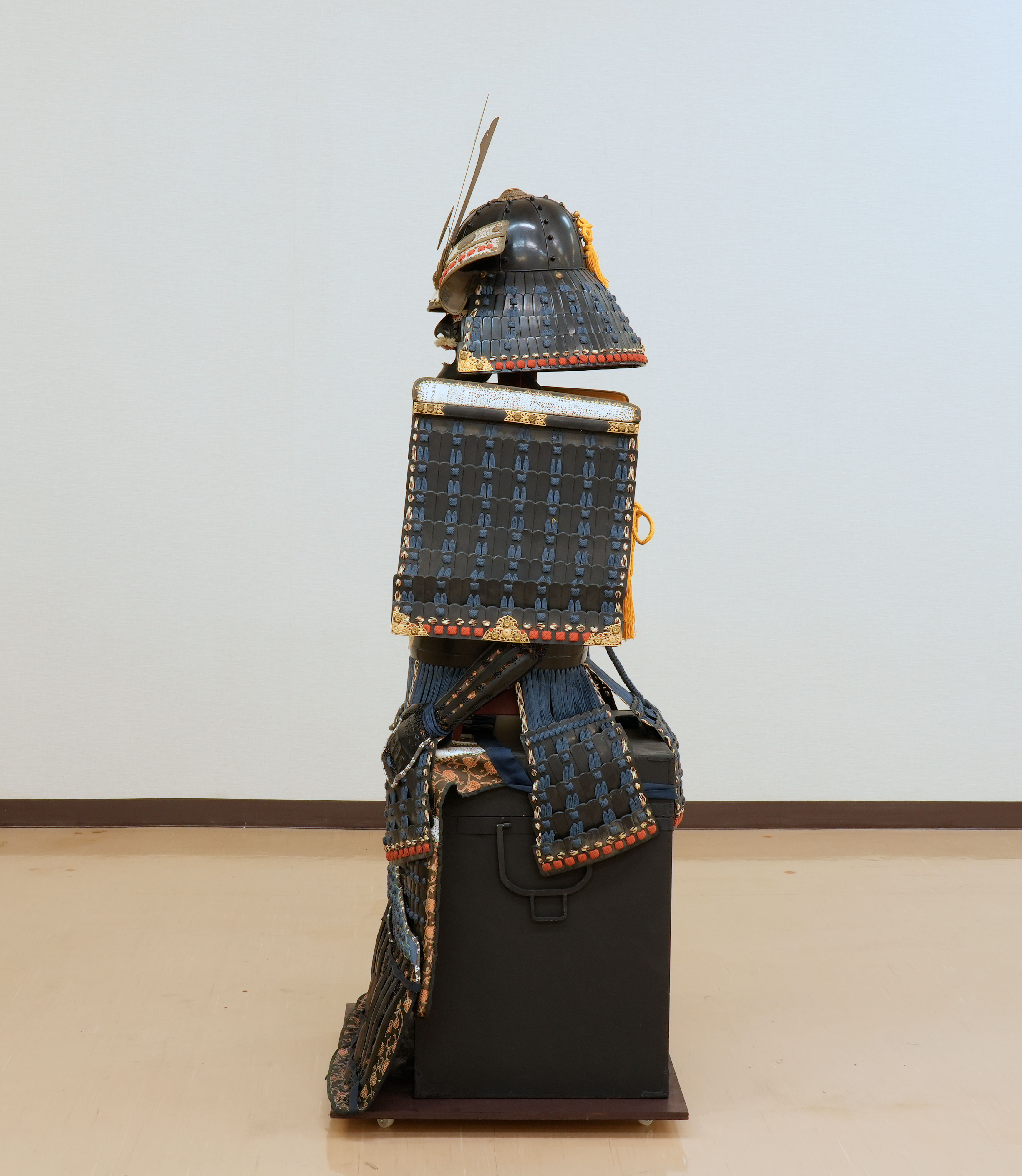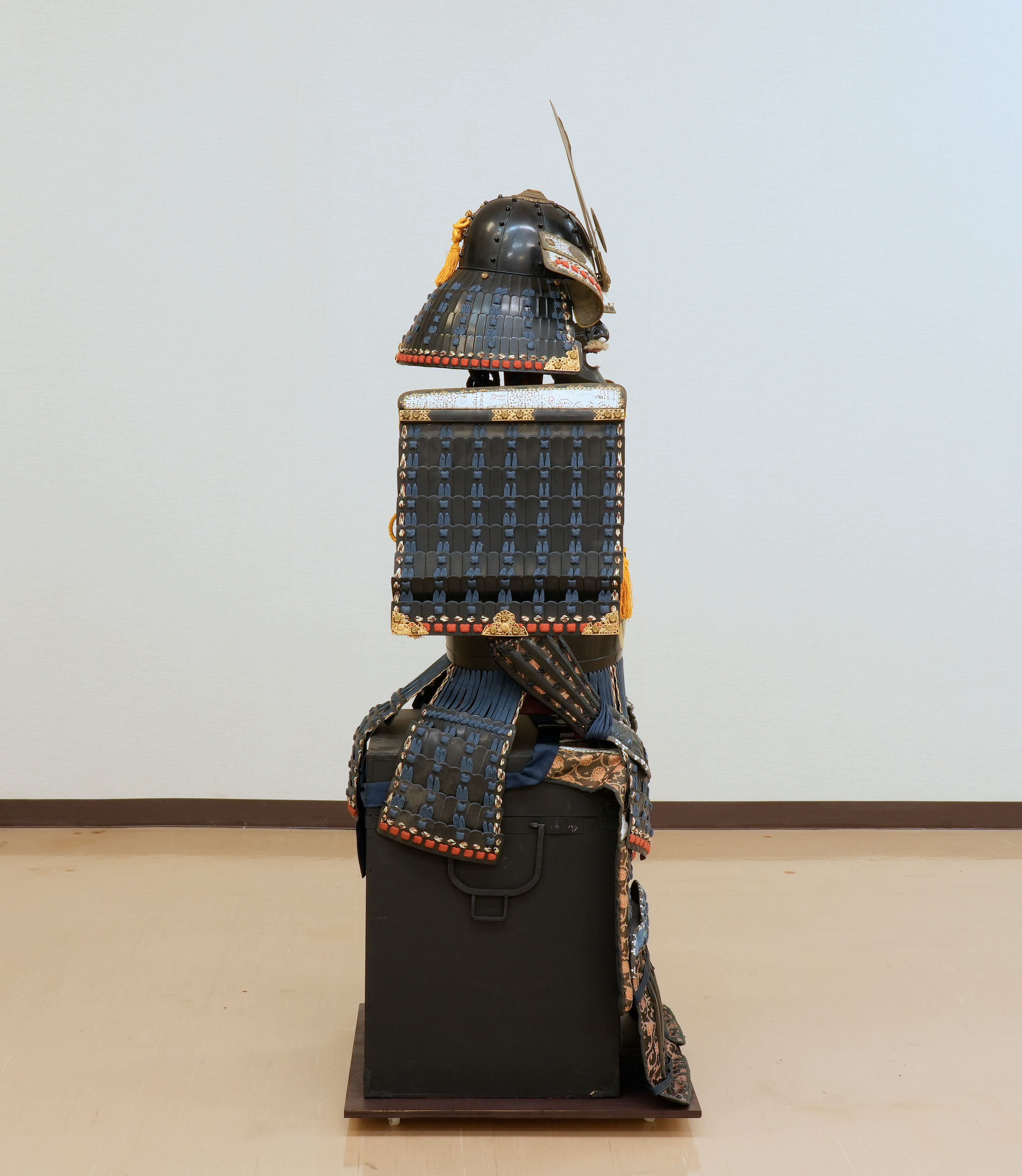 各部を綴る威糸には、隙間を空けて二本ずつ糸を掛ける「素懸威」となっており、毛引威のような華美な装飾を抑え、武具としての機能美を極めた意匠が、紺の糸色と相まって、質実剛健たる武将の気風を見事に体現しています。