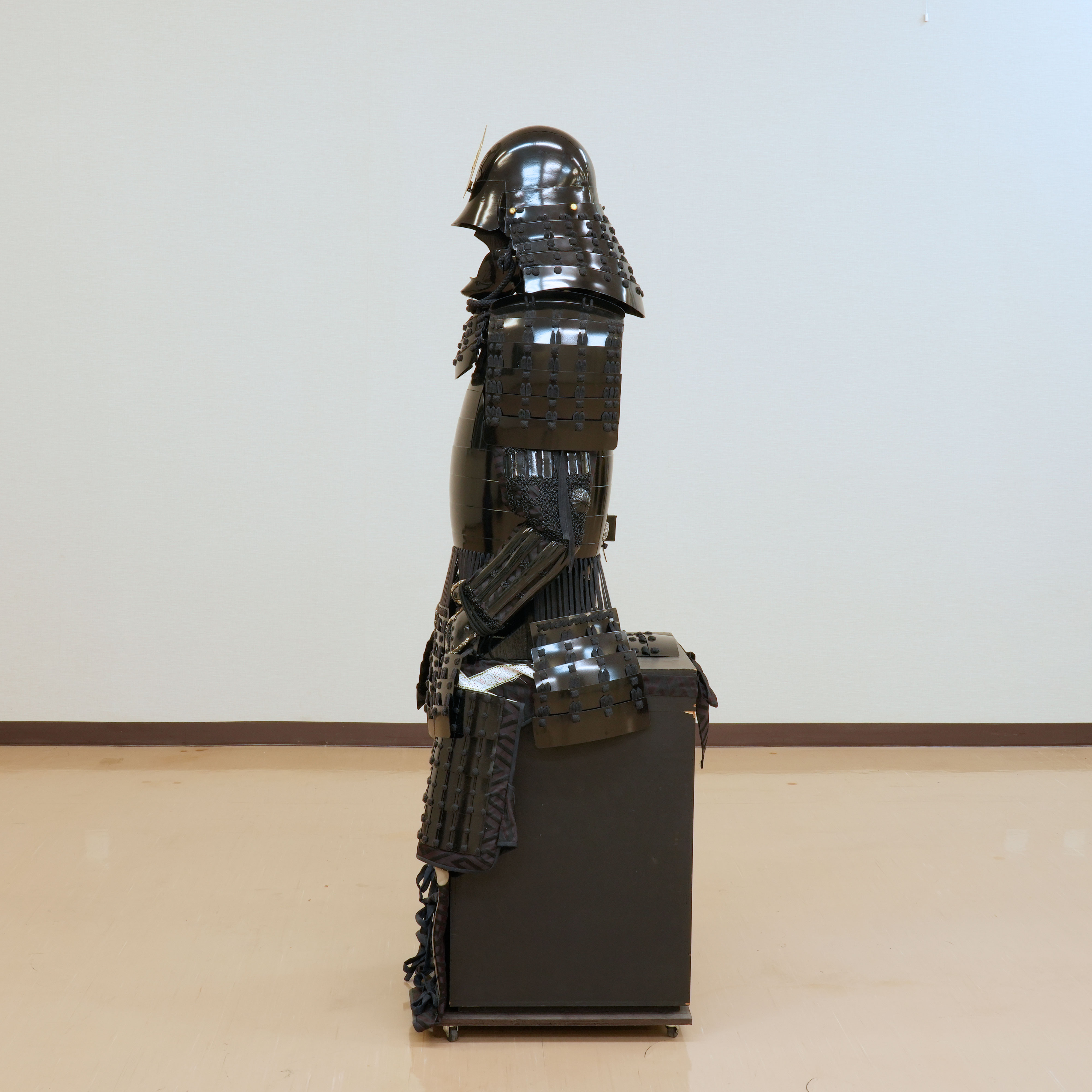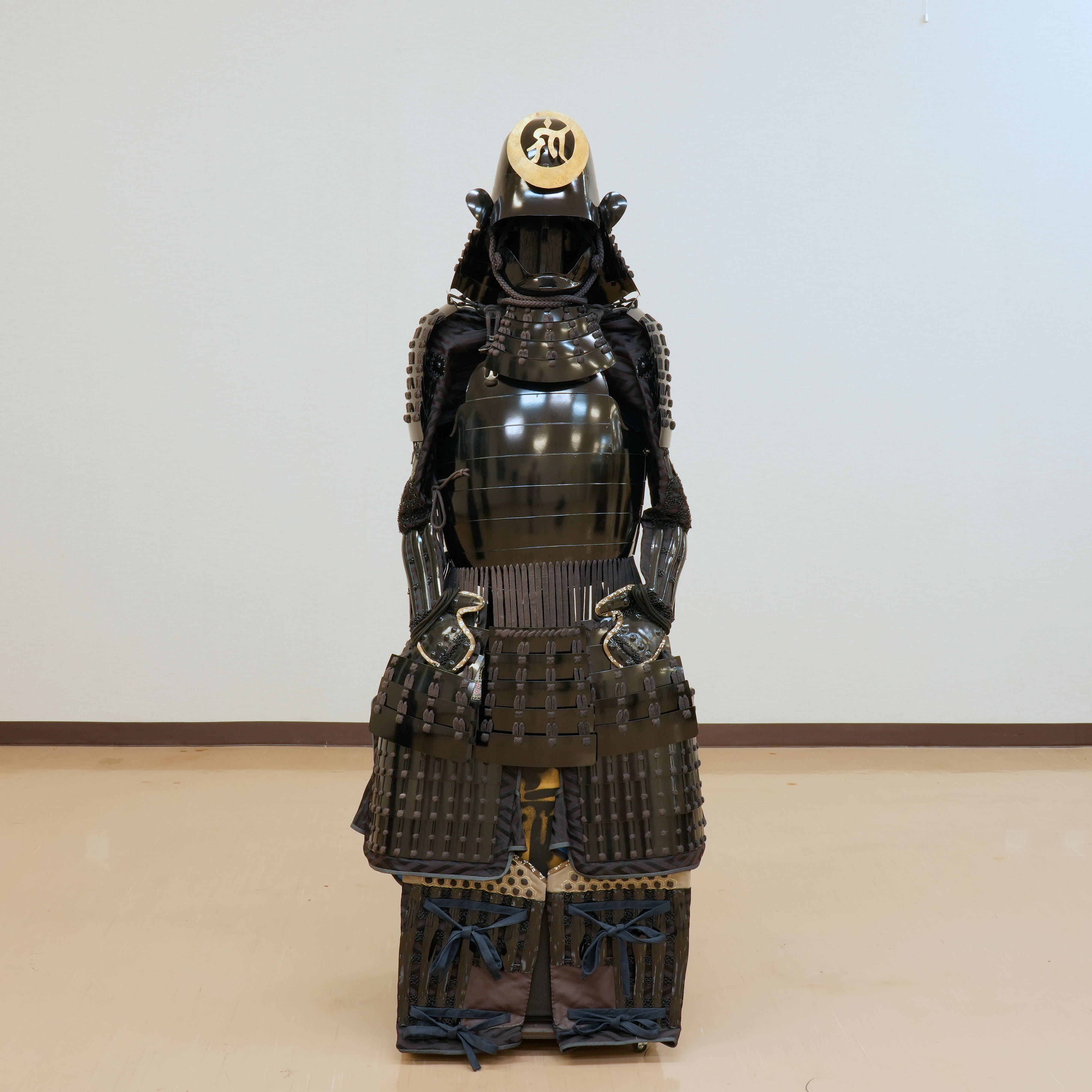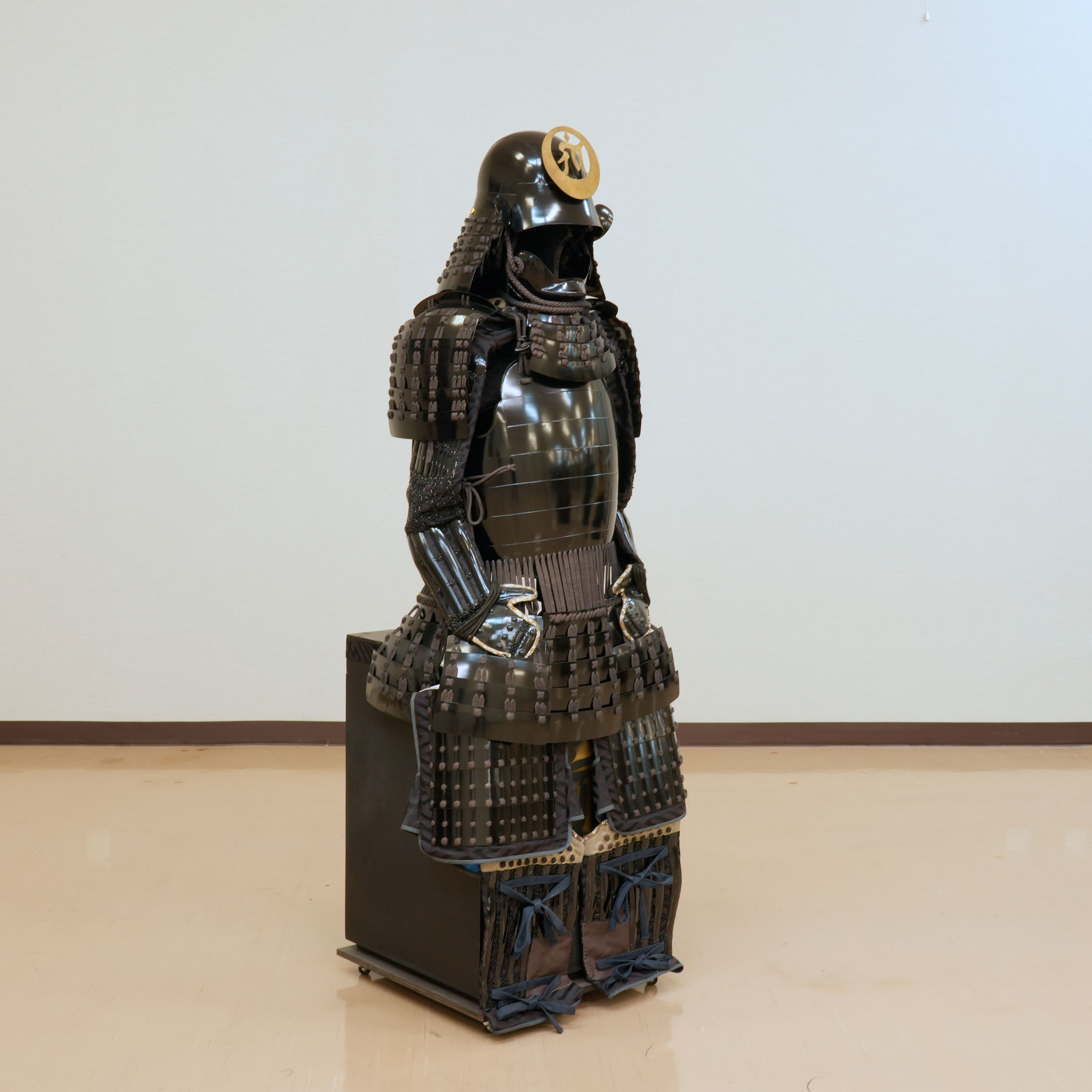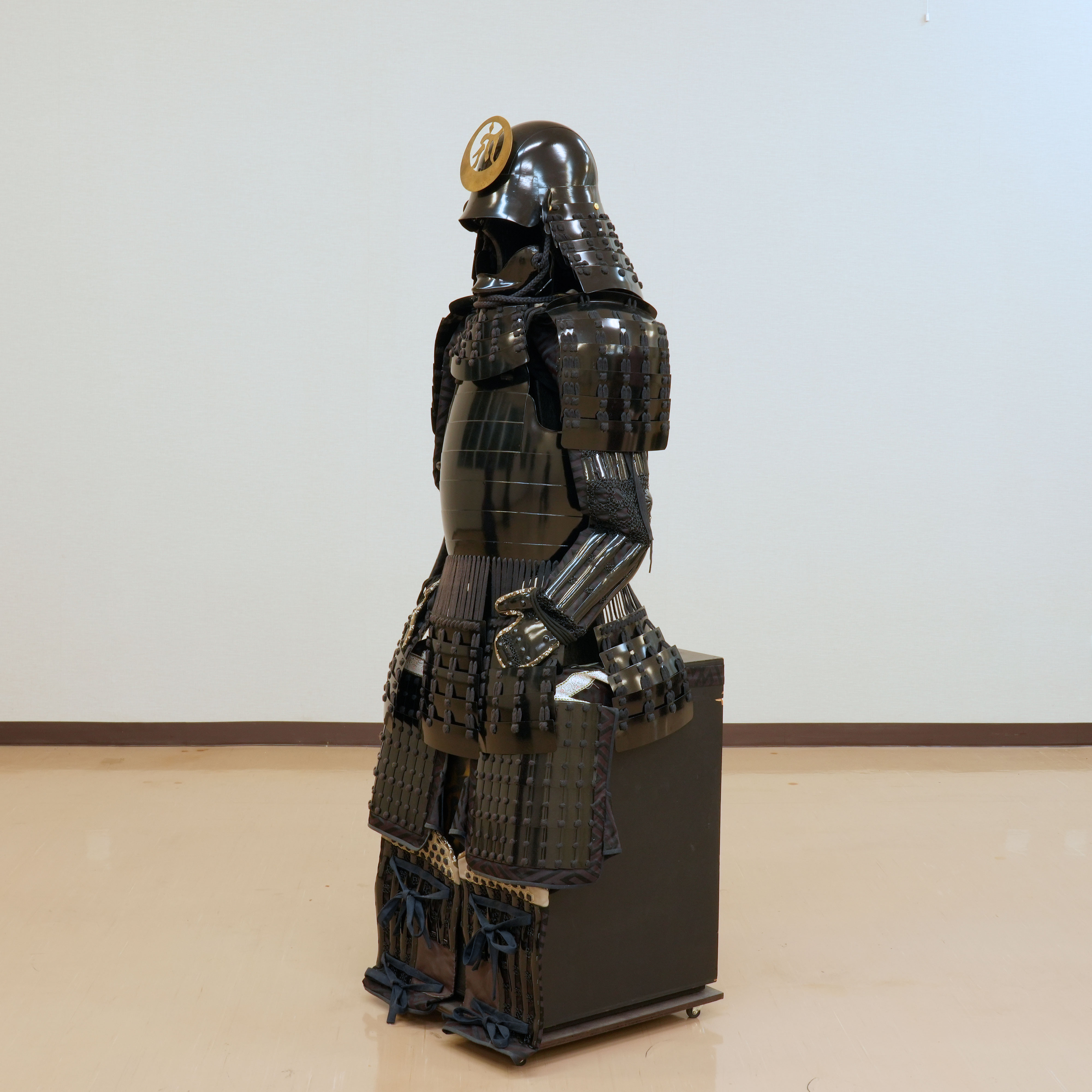 特筆すべきは、その一切の妥協を許さない潔い配色です。兜から胴、袖、そして各部を綴る威糸に至るまで、全体が深い黒一色で統一されており、見る者を圧倒する静謐な迫力に満ちています。その漆黒の総身の中で唯一、兜に掲げられた金色の前立だけが眩い光を放ち、武将の揺るぎない誇りと美学を鮮烈に印象づけています。