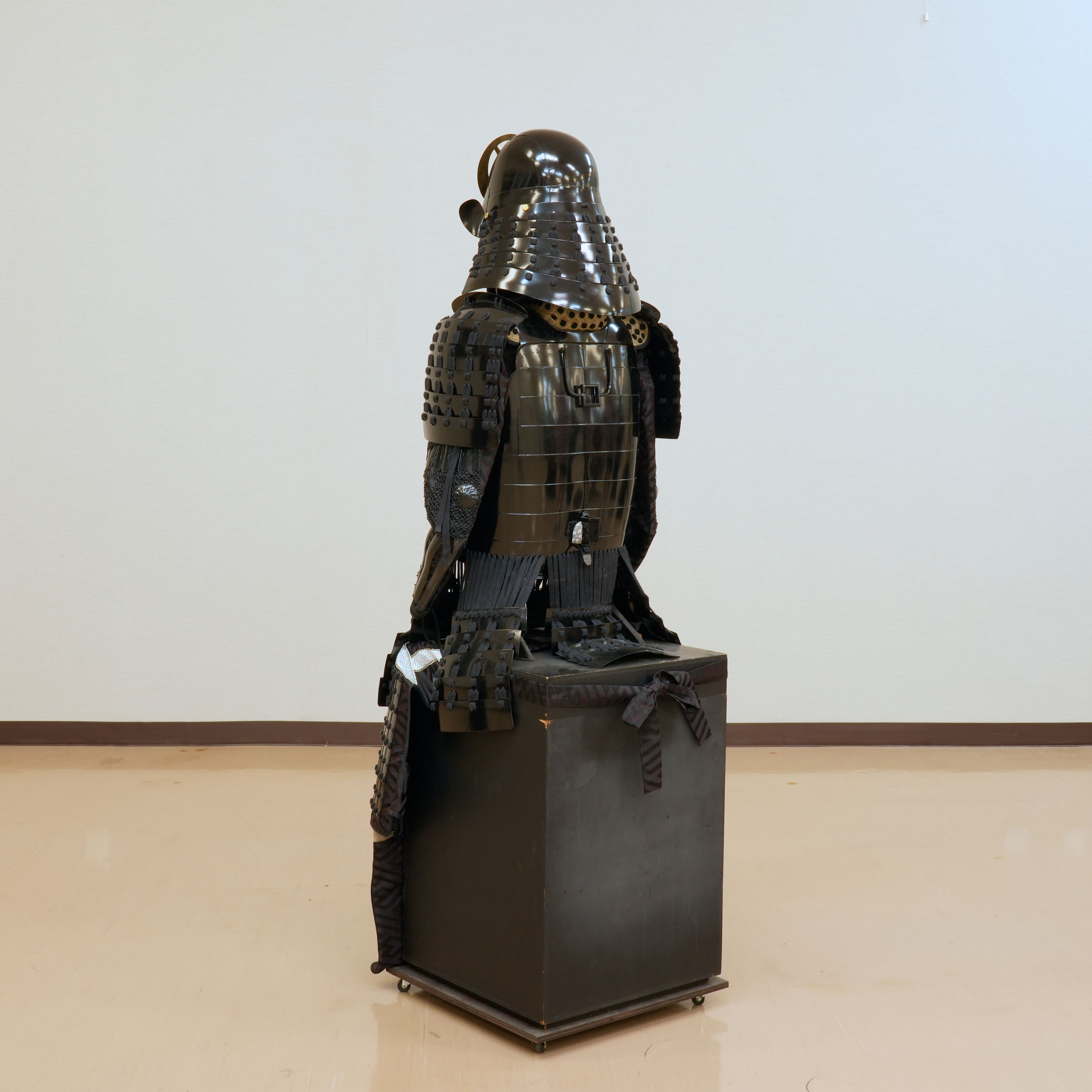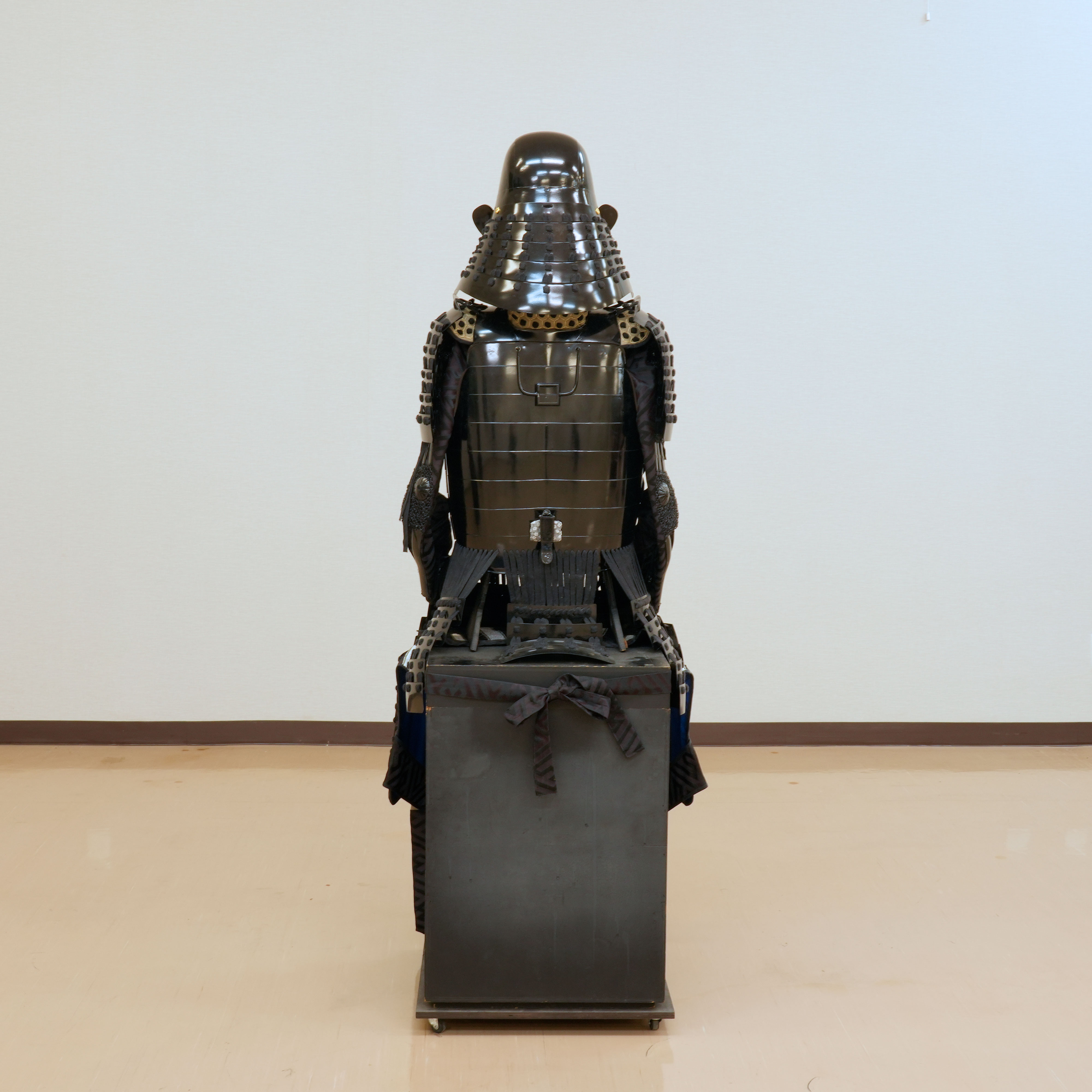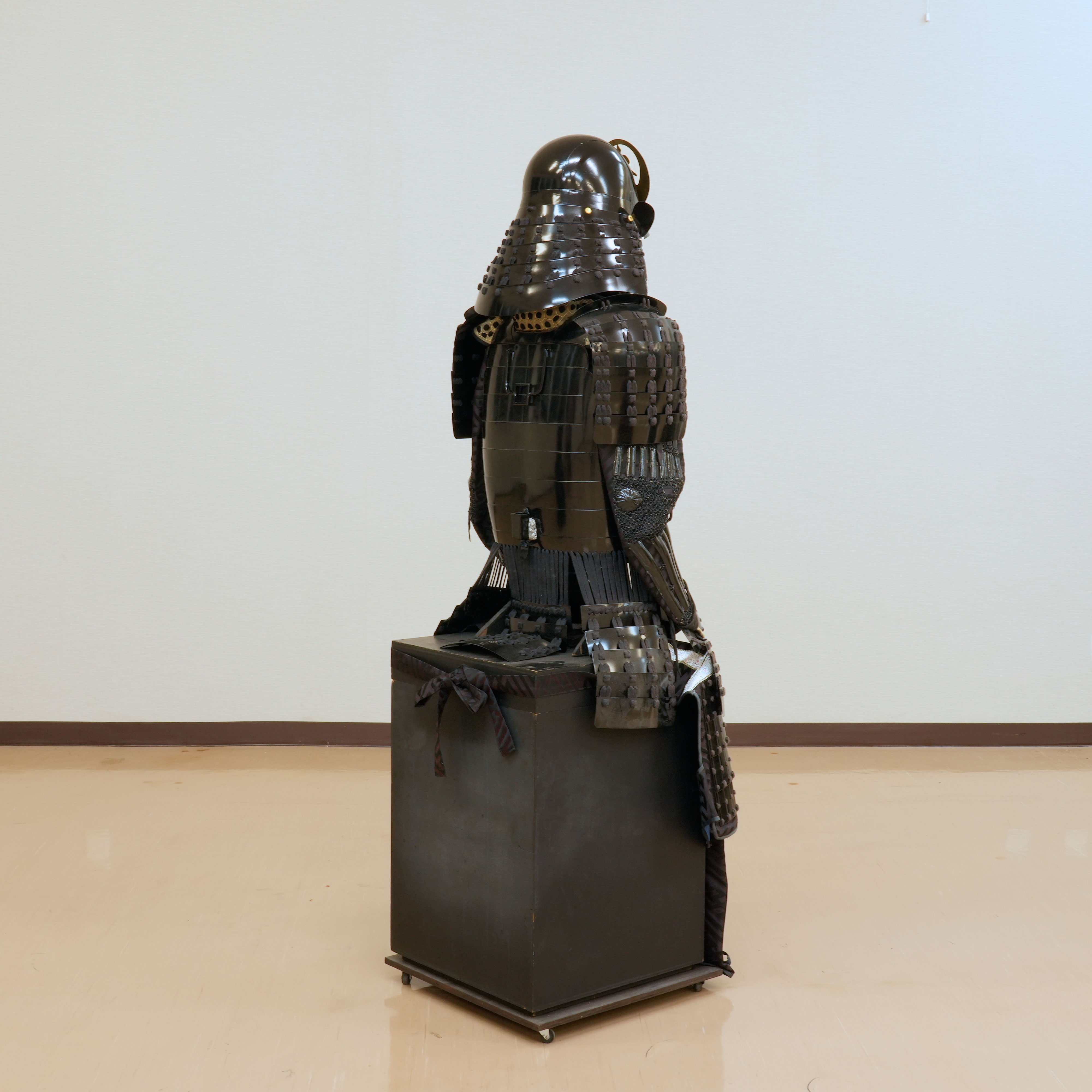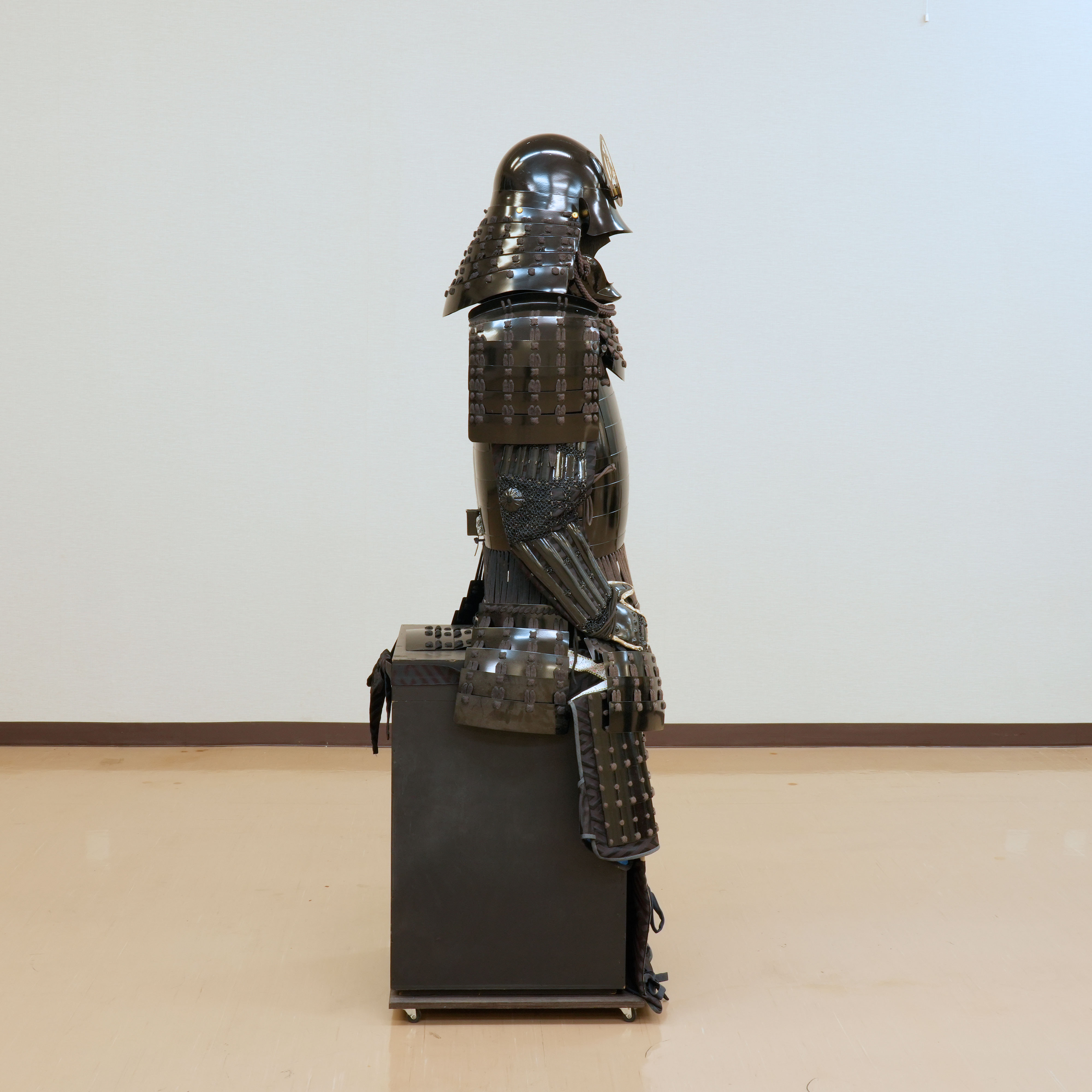 特筆すべきは、その一切の妥協を許さない潔い配色です。兜から胴、袖、そして各部を綴る威糸に至るまで、全体が深い黒一色で統一されており、見る者を圧倒する静謐な迫力に満ちています。その漆黒の総身の中で唯一、兜に掲げられた金色の前立だけが眩い光を放ち、武将の揺るぎない誇りと美学を鮮烈に印象づけています。