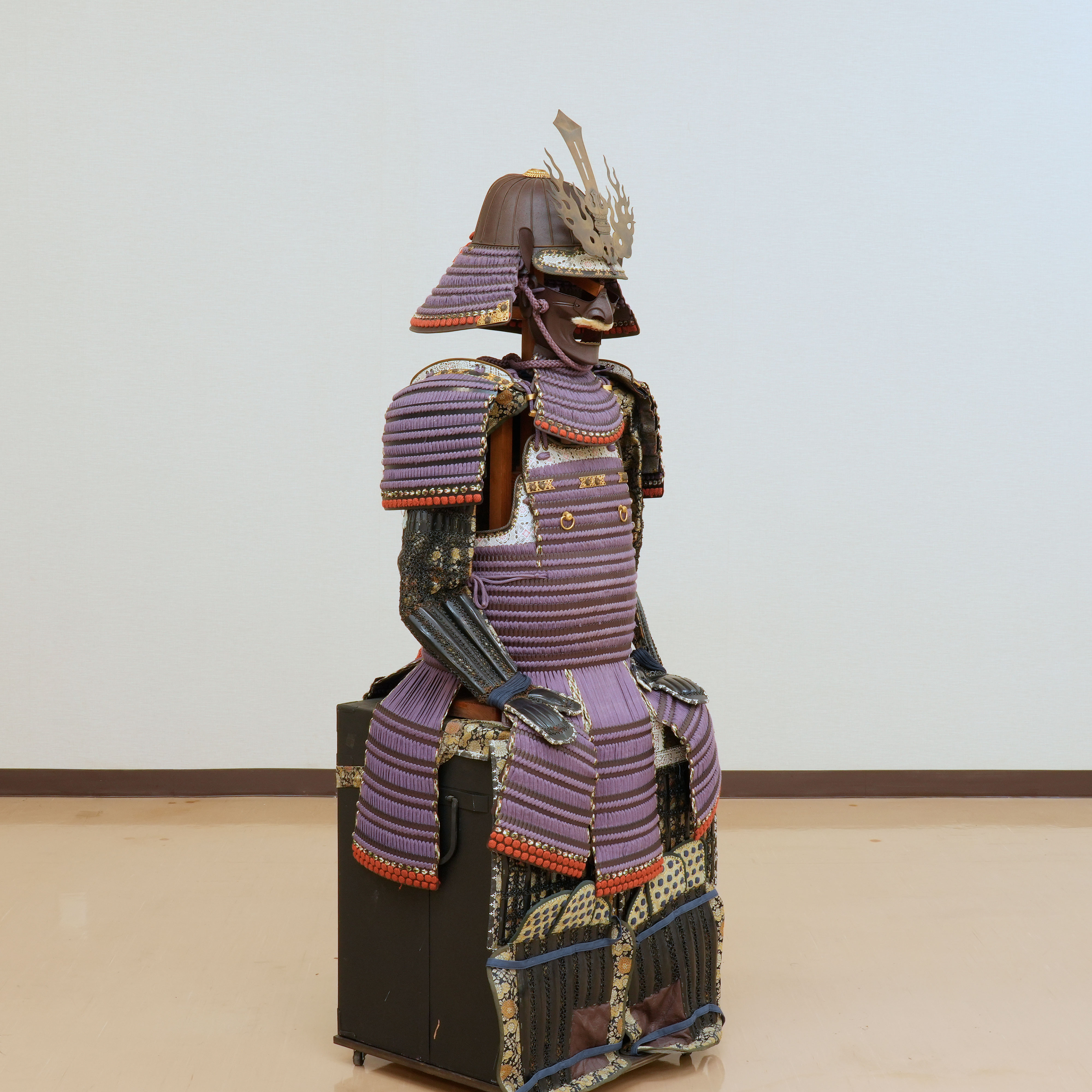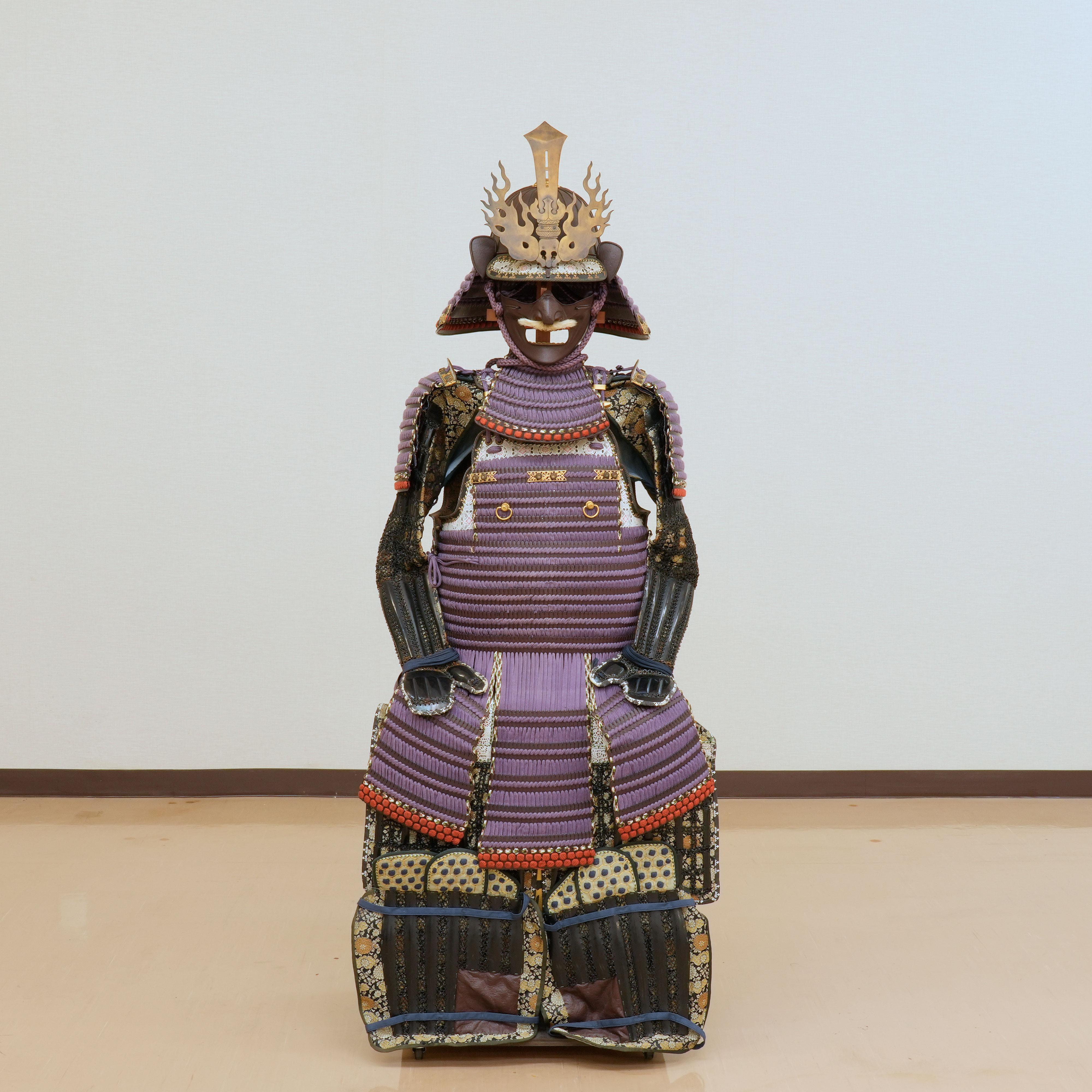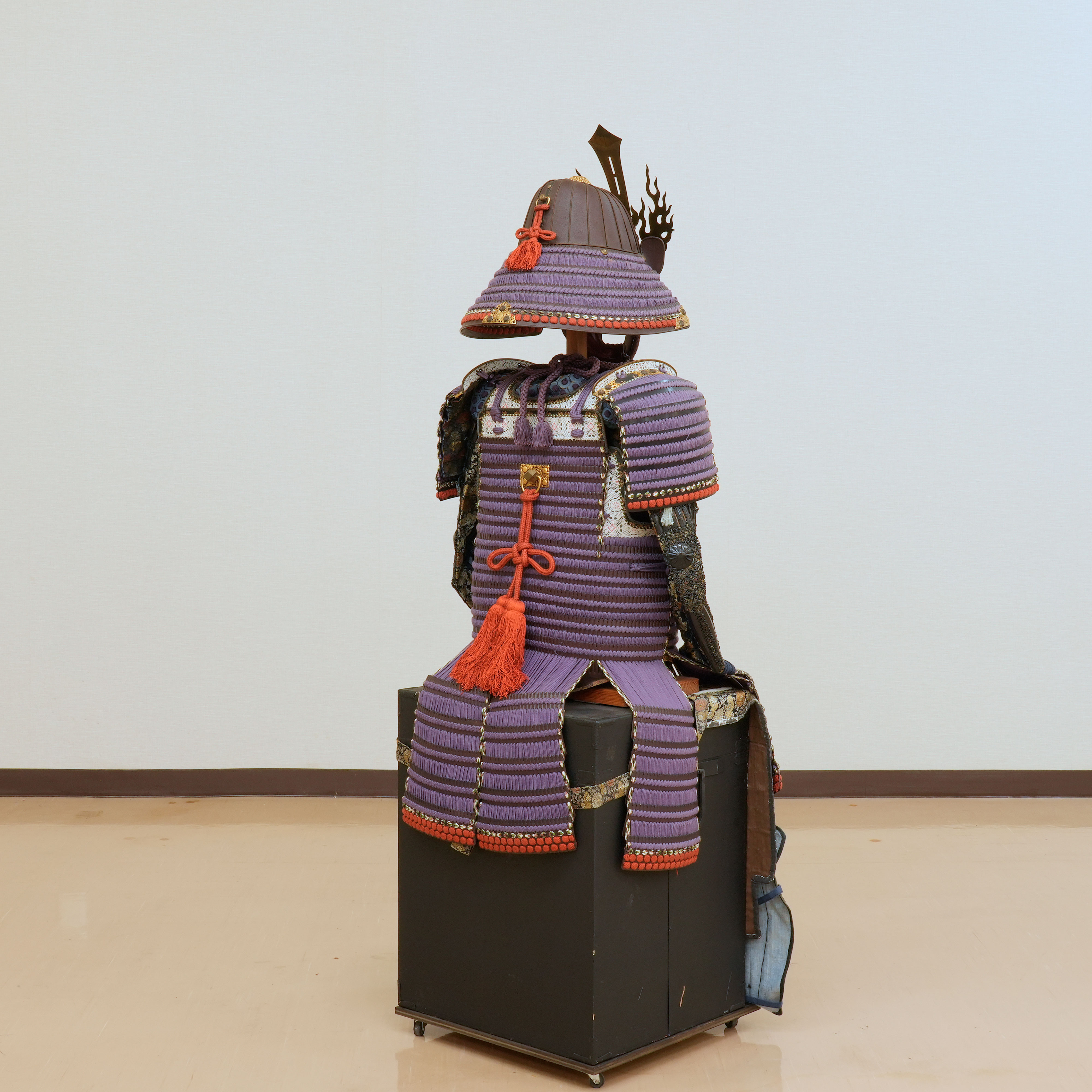 昭和後期に制作された、華麗な紫糸の威と重厚な鉄錆地塗の対比が見事な二枚胴具足です。